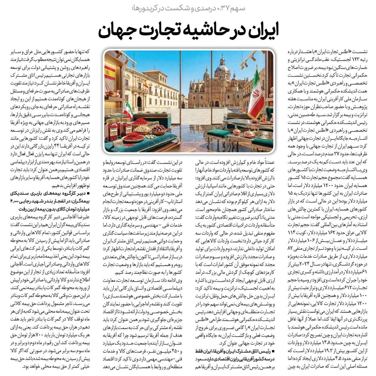 رئیس اتاق مشترک ایران و آفریقا: ایران فقط در سه کشور آفریقایی رایزن اقتصادی دارد مسعود برهمن رئیس اتاق مشترک ایران و آفریقا هم در این نشست گفت: در راستای توسعه روابط و تقویت تجارت، صندوق ضمانت صادرات با حدود سه میلیارد دلار از سرمایهگذاری ایرانیان در قاره آفریقا حمایت میکند. همچنین صندوق توسعه ملی حدود دو میلیارد یورو پشتیبانی از طرحهای استارتاپ – کارآفرینی در حوزه توسعه تجارت انجام میدهد.وی افزود: آفریقا با جمعیت بزرگ و بازار گسترده، فرصتهای قابل توجهی در زمینه کالا، خدمات فنی – مهندسی و سرمایهگذاری دارد، اما در این عرصه نیازمند زیرساختها، سیاستگذاری و حمایت دولتی هستیم.رئیس اتاق مشترک ایران و آفریقا با انتقاد از فقدان نقشه راه تجارت اظهار کرد: در بازار صادراتی تا کنون با چالشهای متعددی روبهرو هستیم که باید بازارها و وضعیت تجارت کشورها را به صورت نظاممند رصد کنیم.