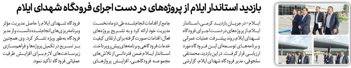 ایلام- در جریان بازدید کرمی، استاندار ایلام، از پروژههای در دست اجرای فرودگاه شهدای ایلام، روند پیشرفت عملیات عمرانی و برنامههای توسعهای این فرودگاه مورد ارزیابی قرار گرفت. در این بازدید، محمدتقی سلجوقی، مدیر فرودگاه شهدای ایلام، گزارشی جامع از اقدامات انجامشده طی دو ماه نخست مدیریت خود ارائه کرد و به تشریح پروژههای فعال، اقدامات صورتگرفته برای ارتقای کیفیت خدمات فرودگاهی و برنامههای پیشِرو پرداخت. استاندار ایلام ضمن قدردانی از تلاشهای مجموعه فرودگاهی، افزایش پروازهای فرودگاه شهدای ایلام را حاصل مدیریت مؤثر و برنامهریزیهای انجامشده دانست و از مدیر فرودگاه بهطور ویژه تشکر کرد. وی همچنین بر تسریع در تکمیل پروژهها و فراهمسازی زیرساختهای لازم برای افزایش ظرفیت عملیاتی فرودگاه تأکید نمود.