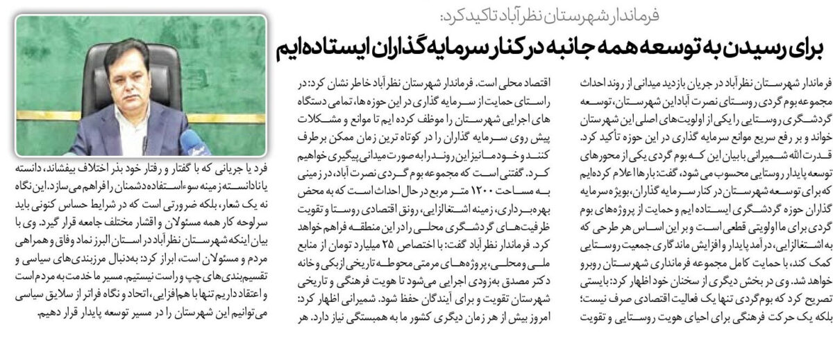 فرماندار شهرستان نظرآباد در جریان بازدید میدانی از روند احداث مجموعه بوم گردی روستای نصرت‌ آباد این شهرستان، توسعه گردشگری روستایی را یکی از اولویت‌های اصلی این شهرستان خواند و بر رفع سریع موانع سرمایه‌ گذاری در این حوزه تأکید کرد. قدرت الله شمیرانی با بیان این که بوم‌ گردی یکی از محورهای توسعه پایدار روستایی محسوب می شود، گفت: بارها اعلام کرده‌ایم که برای توسعه شهرستان در کنار سرمایه‌ گذاران، بویژه سرمایه گذاران حوزه گردشگری ایستاده ایم و حمایت از پروژه‌های بوم‌ گردی برای ما اولویتی قطعی است و بر این اساس هر طرحی که به اشتغالزایی، درآمد پایدار و افزایش ماندگاری جمعیت روستایی کمک کند، با حمایت کامل مجموعه فرمانداری شهرستان روبرو خواهد شد. وی در بخش دیگری از سخنان خود اظهار کرد: بایستی تصریح کرد که بوم‌گردی تنها یک فعالیت اقتصادی صرف نیست؛ بلکه یک حرکت فرهنگی برای احیای هویت روستایی و تقویت اقتصاد محلی است. فرماندار شهرستان نظرآباد خاطر نشان کرد: در راستای حمایت از سرمایه گذاری در این حوزه ها، تمامی دستگاه‌ های اجرایی شهرستان را موظف کرده ایم تا موانع و مشکلات پیش روی سرمایه‌ گذاران را در کوتاه‌ ترین زمان ممکن برطرف کنند و خود ما نیز این روند را به‌ صورت میدانی پیگیری خواهیم کرد. گفتنی است که مجموعه بوم گردی نصرت آباد، در زمینی به مساحت ۱۲۰۰ متر مربع در حال احداث است که به محض بهره‌برداری، زمینه‌ اشتغالزایی، رونق اقتصادی روستا و تقویت ظرفیت‌های گردشگری محلی را در این منطقه فراهم خواهد کرد. فرماندار نظرآباد گفت: با اختصاص ۲۵ میلیارد تومان از منابع ملی و محلی، پروژه‌های مرمتی محوطه تاریخی ازبکی و خانه دکتر مصدق به‌زودی اجرایی می‌شود تا هویت فرهنگی و تاریخی شهرستان تقویت و برای آیندگان حفظ شود. شمیرانی اظهار کرد: امروز بیش از هر زمان دیگری کشور ما به همبستگی نیاز دارد. هر فرد یا جریانی که با گفتار و رفتار خود بذر اختلاف بیفشاند، دانسته یا نادانسته زمینه سوءاستفاده دشمنان را فراهم می‌سازد. این نگاه نه یک شعار، بلکه ضرورتی است که در شرایط حساس کنونی باید سرلوحه کار همه مسئولان و اقشار مختلف جامعه قرار گیرد. وی با بیان اینکه شهرستان نظرآباد در استان البرز نماد وفاق و همراهی مردم و مسئولان است، ابراز کرد: به‌دنبال مرزبندی‌های سیاسی و تقسیم‌بندی‌های چپ و راست نیستیم. مسیر ما خدمت به مردم است و اعتقاد داریم تنها با هم‌افزایی، اتحاد و نگاه فراتر از سلایق سیاسی می‌توانیم این شهرستان را در مسیر توسعه پایدار قرار دهیم.
