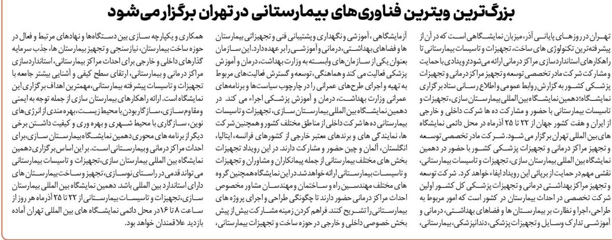 تهران در روزهای پایانی آذر، میزبان نمایشگاهی است که در آن از پیشرفتهترین تکنولوژی های ساخت، تجهیزات و تاسیسات بیمارستانی تا راهکارهای استانداردسازی مراکز درمانی ارائه میشود؛رویدادی با حمایت و مشارکت شرکت مادر تخصصی توسعه و تجهیز مراکز درمانی و تجهیزات پزشکی کشور به گزارش روابط عمومی و اطلاع رسانی ستاد برگزاری نمایشگاه؛ دهمین نمایشگاه بین المللی بیمارستان سازی، تجهیزات و تاسیسات بیمارستانی با حضور و مشارکت ده ها شرکت داخلی و خارجی از ایران و هفت کشور جهان از 22 تا 25 آذرماه در محل دائمی نمایشگاه های بین المللی تهران برگزار می شود. شرکت مادر تخصصی توسعه و تجهیز مراکز درمانی و تجهیزات پزشکی کشور با حضور در دهمین نمایشگاه بین المللی بیمارستان سازی، تجهیزات و تاسیسات بیمارستانی، نقشی مهم در حمایت از برپائی این رویداد ایفاء خواهد کرد. شرکت توسعه و تجهیز مراکز بهداشتی درمانی و تجهیزات پزشکی کل کشور اولین شرکت تخصصی در احداث بیمارستان در کشور است که امور مربوط به طراحی، اجرا و نظارت بر بیمارستان ها و فضاهای بهداشتی، درمانی و آموزشی تدارک وسایل و تجهیزات پزشکی، دندانپزشکی، بیمارستانی، آزمایشگاهی ، آموزشی و نگهداری و پشتیبانی فنی و تجهیزاتی بیمارستان ها و فضاهای بهداشتی، درمانی و آموزشی را بر عهده دارد. این سازمان بعنوان یکی از سازمانهای وابسته به وزارت بهداشت، درمان و آموزش پزشکی فعالیت می کند و هماهنگی، توسعه و گسترش فعالیتهای مربوط به تهیه و اجرای طرحهای عمرانی را در چارچوب سیاستها و برنامههای عمرانی وزارت بهداشت، درمان و آموزش پزشکی اجراء می کند. در دهمین نمایشگاه بین المللی بیمارستان سازی، تجهیزات و تاسیسات بیمارستانی ده ها شرکت داخلی از مناطق مختلف کشور و همچنین شرکت ها، نمایندگی های و برندهای معتبر خارجی از کشورهای فرانسه، ایتالیا، انگلستان، آلمان و چین حضور و مشارکت دارند. در این رویداد تجهیزات بخش های مختلف بیمارستانی از جمله پیمانکاران و مشاوران و تجهیزات و تاسیسات بیمارستانی ارائه خواهد شد.در این نمایشگاه همچنین گروه های مختلف مهندسین راه و ساختمان و مهندسان مشاور مخصوص احداث مراکز درمانی حضور دارند تا چگونگی طراحی و اجرای پروژه های بیمارستانی را تشریح کنند. فراهم کردن زمینه مشارکت بیش از پیش بخش خصوصی داخلی و خارجی در حوزه ساخت و تجهیزات بیمارستانی، همکاری و یکپارچه سازی بین دستگاهها و نهادهای مرتبط و فعال در حوزه ساخت بیمارستان، نیازسنجی و تجهیز بیمارستان ها، جذب سرمایه گذارهای داخلی و خارجی برای احداث مراکز بیمارستانی، استانداردسازی مراکز درمانی و بیمارستانی، ارتقای سطح کیفی و آشنایی بیشتر جامعه با تجهیزات و تاسیسات پیشرفته بیمارستانی،مهمترین اهداف برگزاری این نمایشگاه است. ارائه راهکارهای بیمارستان سازی از جمله توجه به ایمنی و مقاوم سازی، سازگار بودن با محیط زیست، بهره مندی از انرژیهای نوین، سازگاری با محیط شهری و بهره وری و کیفیت داشتن برخی دیگر از برنامه های محوری دهمین نمایشگاه بیمارستان سازی،برای احداث مراکز درمانی و بیمارستانی است. بر این اساس برگزاری دهمین نمایشگاه بین المللی بیمارستان سازی،تجهیزات و تاسیسات بیمارستانی می تواند قدمی در راستای نوسازی، تجهیز و ساخت بیمارستان های دارای استاندارد بین المللی باشد. دهمین نمایشگاه بین المللی بیمارستان سازی،تجهیزات و تاسیسات بیمارستانی از 22 تا 25 آذرماه هر روز از ساعت 8 تا 16در محل دائمی نمایشگاه های بین المللی تهران آماده بازدید علاقمندان خواهد بود.