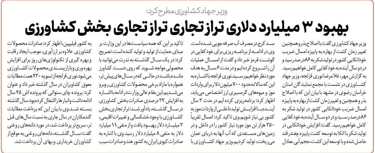 وزیر جهاد کشاورزی گفت: با اصلاح بذر و همچنین تغییر زمان کشت از بهاره به پاییزه امسال ضریب خوداتکایی کشور در تولید شکر به ۸۶ درصد رسید و در دو سال آینده به خودکفایی کامل خواهیم رسید.به گزارش مهر، غلامرضا نوری قزلجه، وزیر جهاد کشاورزی در نشست با مجمع نمایندگان استان خراسان رضوی در مشهد با بیان این که با اصلاح بذر و همچنین و تغییر زمان کشت از بهاره به پاییزه امسال ضریب خوداتکایی کشور در تولید شکر به ۸۶ درصد رسید و در دو سال آینده به خودکفایی کامل خواهیم رسید. گفت: افزایش خوداتکایی در تولید شکر با اتکا به توسعه کشت پاییزه چغندرقند حاصل شده و با توسعه این کشت، حجم آبی معادل سد کرج در مصرف آب صرفه جویی شده است.وی در ادامه از برنامه ریزی برای خودکفایی در گوشت قرمز خبر داد و گفت: از امسال عملیات آن را شروع کرده ایم و در مدت ۶ سال به هدف مورد نظر خواهیم رسید.نوری قزلجه با اشاره به این که سالانه حدود ۷۰۰ میلیون دلار برای واردات موز و میوههای گرمسیری ارز اختصاص مییابد، اظهار کرد: برنامهریزی کرده ایم در مدت ۳ سال آینده با افزایش تولید داخلی از واردات موز به کشور بی نیاز شویم.وی تاکید کرد: امسال تقریباً ۳۵۰ هزار تن موز مورد نیاز کشور را در داخل و در زمینهای مستعدی که آب آنها به دریای عمان میریخت، تولید کردیم.وزیر جهاد کشاورزی با تاکید بر این که همه سیاستها در این وزارت بر مبنای حمایت از تولید و تولید کننده است، تصریح کرد: در یک سال گذشته به ندرت میتوانید با محصولی مواجه شوید که روی دست کشاورز مانده باشد در حالی که در سالهای پیش تر، همواره با مازاد برخی محصولات کشاورزی روبرو میشدیم.این مقام عالی وزارت در ادامه با اشاره به افزایش ۳۲ درصدی صادرات بخش کشاورزی در سال گذشته، یادآور شد: تراز تجاری بخش کشاورزی با وجود خشکسالی و تغییرات اقلیمی، ۳ میلیارد دلار بهبود یافت و از منفی ۱۱ میلیارد دلار به منفی ۸ میلیارد دلار رسید.وی با اشاره به صادرات کیوی ایران به کشور هند و صادرات سیب به کشور فیلیپین، اظهار کرد: صادرات محصولات کشاورزی علاوه بر ارزآوری، موجب ایجاد رقابت و بهره گیری از تکنولوژیهای روز برای افزایش بهره وری و بازارپسندی محصولات کشاورزی میشود.نوری قزلجه از تسویه ۲۳۰ همت مطالبات معوق کشاورزان در سال گذشته خبر داد و عنوان کرد: پرونده چای سنواتی که پرونده اش ۲۵ سال ادامه داشت و انبارها را اشغال کرده بود، سال گذشته بسته شد.وی با بیان این که پرداخت مطالبات گندمکاران در سال جاری به نسبت سالهای قبل تر، سریعتر پرداخت شد، در مورد دانههای روغنی گفت: سال گذشته، دانههای روغنی به موقع از کشاورزان خریداری و بهای آن پرداخت شد.