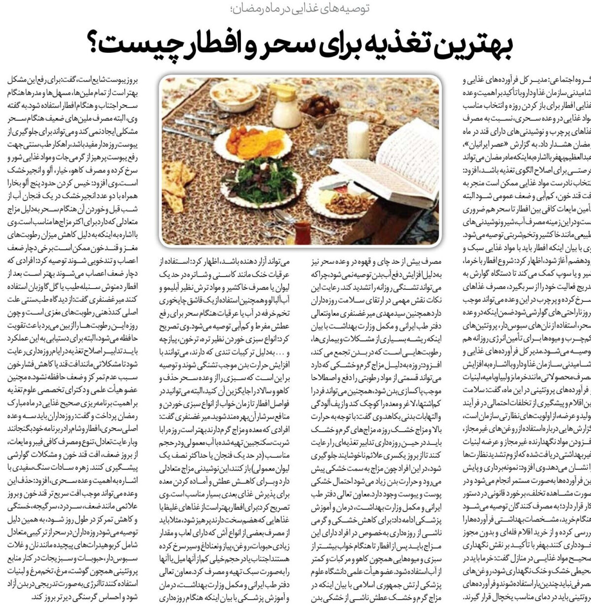 گروه اجتماعی: مدیرکل فرآوردههای غذایی و آشامیدنی سازمان غذا و دارو با تأکید بر اهمیت وعده غذایی افطار برای باز کردن روزه و انتخاب مناسب مواد غذایی در وعده سحری، نسبت به مصرف غذاهای پرچرب و نوشیدنیهای دارای قند در ماه رمضان هشدار داد. به گزارش «عصر ایرانیان»، عبدالعظیم بهفر با اشاره به اینکه ماه رمضان میتواند فرصتی برای اصلاح الگوی تغذیه باشد، افزود: انتخاب نادرست مواد غذایی ممکن است منجر به افت قند خون، کمآبی و ضعف عمومی شود البته تأمین مایعات کافی بین افطار تا سحر هم ضروری است و در این زمینه مصرف آب، شیر و نوشیدنیهای طبیعی مانند خاکشیر و تخمشربتی توصیه میشود.وی با بیان اینکه افطار باید با مواد غذایی سبک و زودهضم آغاز شود، اظهار کرد: شروع افطار با خرما، شیر و یا سوپ کمک میکند تا دستگاه گوارش به تدریج فعالیت خود را از سر بگیرد، مصرف غذاهای سرخکرده و پرچرب در این وعده میتواند موجب بروز ناراحتیهای گوارشی شود ضمن اینکه در وعده سحر، استفاده از نانهای سبوسدار، پروتئینهای کمچرب و میوهها برای تأمین انرژی روزانه هم توصیه میشود.مدیرکل فرآوردههای غذایی و آشامیدنی سازمان غذا و دارو با اشاره به افزایش مصرف محصولاتی مانند خرما، زولبیا و بامیه، لبنیات و فرآوردههای پروتئینی در این ماه، گفت: سلامت این اقلام و پیشگیری از تخلفات احتمالی در فرآیند تولید و عرضه، از اولویتهای نظارتی سازمان است، گزارشهایی درباره استفاده از روغنهای غیرمجاز، افزودن مواد نگهدارنده غیرمجاز و عرضه لبنیات غیربهداشتی دریافت شده که لزوم تشدید نظارتها را نشان میدهد.وی افزود: نمونهبرداری و پایش این فرآوردهها بهصورت مستمر انجام میشود و در صورت مشاهده تخلف، برخورد قانونی در دستور کار قرار دارد؛ به مصرفکنندگان توصیه میشود هنگام خرید، مشخصات بهداشتی فرآوردهها را بررسی کرده و از خرید اقلام فلهای و بدون مجوز خودداری کنند.بهفر با تأکید بر نقش نگهداری صحیح مواد غذایی در منازل گفت: خرما باید در محیطی خشک و خنک نگهداری شود، روغنهای مصرفی نباید چندین بار استفاده شوند و فرآوردههای پروتئینی باید در دمای مناسب یخچال قرار گیرند. مصرف بیش از حد چای و قهوه در وعده سحر نیز بهدلیل افزایش دفع آب بدن توصیه نمیشود، چراکه میتواند تشنگی روزانه را تشدید کند. رعایت این نکات نقش مهمی در ارتقای سلامت روزهداران داردهمچنین سیدمهدی میرغضنفری معاونتعالی دفتر طب ایرانی و مکمل وزارت بهداشت با بیان اینکه ریشه بسیاری از مشکلات و بیماریها، رطوبتهایی است که در بدن تجمع می کند، افزود: روزه بهدلیل مزاج گرم و خشکی که دارد میتواند قسمتی از مواد رطوبتی را دفع و اصطلاحا موجب پاکسازی بدن شود، همچنین میتواند فرد را کماشتها، لاغر و معده را کوچک کند و از پفآلودگی و التهابات بدنی بکاهد.وی گفت: با توجه به حرارت بالا و مزاج خشک روزه، مزاجهای گرم و خشک باید در حین روزهداری تدابیر تغذیهای را رعایت کنند تا از بروز یکسری علائم ناخوشایند جلوگیری شود، در این افراد چون مزاج به سمت خشکی پیش میرود و حرارت بدن زیاد میشود احتمال خشکی پوست و یبوست وجود دارد.معاون تعالی دفتر طب ایرانی و مکمل وزارت بهداشت، درمان و آموزش پزشکی ادامه داد: برای کاهش خشکی و گرمی ناشی از روزهداری بهخصوص در افراد دارای این مزاج باید پس از افطار تا هنگام خواب بیشتر از سبزی و میوههایی همچون کاهو و مرکبات و کمتر از آب استفاده شود.عضو هیأت علمی دانشگاه علوم پزشکی ارتش جمهوری اسلامی با بیان اینکه در مزاج گرم و خشک عطش ناشی از خشکی بدن میتواند آزار دهنده باشد، اظهار کرد: استفاده از عرقیات خنک مانند کاسنی و شاتره در حد یک لیوان یا مصرف خاکشیر و مواد ترش نظیر آبلیمو و آبآلبالو و همچنین استفاده از یک قاشق چایخوری تخم خرفه در آب یا عرقیات هنگام سحر برای رفع عطش مفرط و کمآبی توصیه میشود.وی تصریح کرد: انواع سبزی خوردن نظیر تره، ترخون، پیازچه و… بهدلیل ترکیبات تندی که دارند، میتوانند با افزایش حرارت بدن موجب ت