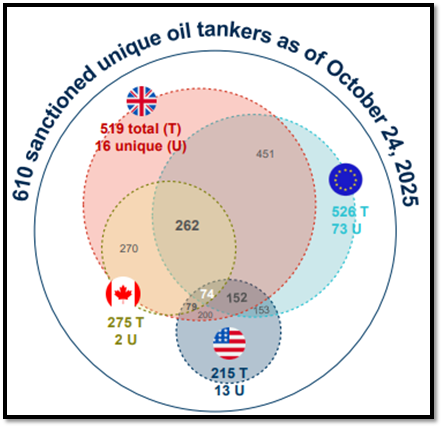 از دیگر نتایج مهم تحریمها، فاصله گرفتن روسیه از شبکه خدمات بینالمللی و غربی و رفتن به سمت شبکه ناوگان غیر رسمی و خارج از چارچوب متعارف بینالمللی بود. تا پیش از شروع تحریمهای غرب علیه روسیه، این کشور مانند بسیاری از کشورها از شبکه خدمات دریایی غرب از جمله باشگاه بیمه مسئولیت و غرامت و نفتکشهای منطبق با استاندارهای مرسوم به خصوص از کشورهای غربی از جمله یونان استفاده میکرد. با اعمال تحریمها علیه روسیه، این کشور از این ساختار مرسوم فاصله گرفت و به شبکه نفتکش و بیمههای دیگر روی آورد. استفاده از بیمههای بومی، کشورهای شرق آسیا، نفتکشهای معروف به ناوگان سایه با تغییر پرچم، استفاده از نفتکشهای فرسودهتر، نفتکشهای شرکتهای اماراتی و اقداماتی مانند کشتی به کشتی کارهایی بوده که روسیه برای دور زدن تحریمهای غرب انجام داده است. براساس آمارها در آگوست سال ۲۰۲۵ تنها ۴۵ درصد از نفت و فرآوردههای نفتی روسیه با تکیه بر خدمات دریایی غربی از جمله بیمه گروه بینالمللی مسئولیت و غرامت انجام میگیرد، این درحالی است که پیش از این بالای ۸۵ درصد از نفت و فرآوردهنفتی دریایی روسیه با تکیه بر ناوگان غربی منتقل میشد[15]. با گسترش استفاده روسیه از ناوگان موازی با ساختار رسمی که عمدتا با کشتیهای قدیمیتر، با پرچم کشورهای دیگر یا شرکتهای غیرغربی انجام میشد، آمریکا و اروپا قرار دادن این کشتیها یا شرکتهای بیمه در لیست تحریم را در دستورکار خود قرار دادند. بهطور مثال آمریکا در ۱۰ ژانویه ۲۰۲۵، بیش از ۱۸۰ کشتی، چند شرکت کشتیرانی و چند شرکت بیمه را در لیست تحریم خود قرارداد. این لیست علاوه بر کشتیها و شرکتهای روسی، شامل کشتیهایی با پرچم پاناما و باربادوس و شرکتهای کشتیرانی اماراتی نیز میشد[16]. تحریمهای اتحادیه اروپا نیز شامل چنین اقداماتی است. براساس آمارها تا اکتبر سال ۲۰۲۵ تعداد