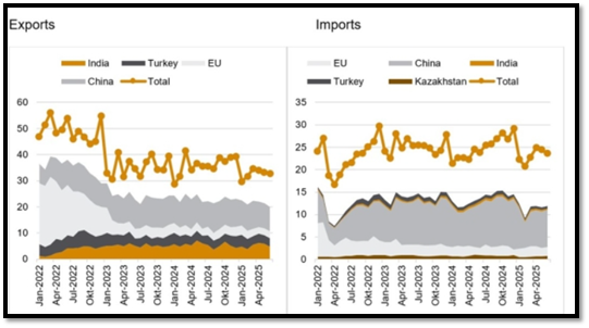 یکی دیگر از نتایج اعمال تحریم بر روسیه تغییر نقشه تجاری این کشور و تغییر شرکای تجاری روسیه بود. تا پیش از شروع جنگ نیمی از صادرات روسیه به اتحادیه اروپا بود. این درحالی است که در نیمه سال ۲۰۲۵ تنها ۸ درصد صادرات روسیه به اروپا است. در مورد واردات نیز به همین شکل است. درحالی که حدود یک سوم واردات روسیه پیش از جنگ از اتحادیه اروپا بود، این میزان در نیمه سال ۲۰۲۵ به ۱۲ درصد کاهش یافته. این کاهش تجارت با اروپا با افزایش تجارت با چین، هند و ترکیه در روابط تجاری روسیه همراه بود. به نحوی که براساس آمارها ۳۰ درصد از صادرات روسیه اکنون به چین انجام میگیرد، این درحالی است که سهم این موضوع قبل از جنگ تنها ۱۶ درصد بود. همچنین واردات از چین نیز از ۳۰ درصد قبل از جنگ به ۳۵ درصد در نیمه سال ۲۰۲۵ رسیده است. در مورد اروپا نیز این موضوع صادق است. این کشور با کاهش سهم روسیه در تجارت خود، تجارت با کشورهایی مانند آمریکا یا نروژ را افزایش داده است. در نهایت باید گفت یکی از اثرات جدی جنگ فاصله گرفته روسیه و غرب و نزدیک شدن روسیه به کشورهای آسیایی است[10].
