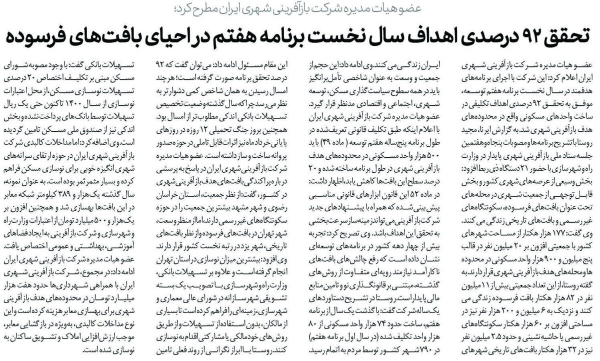 عضو هیات مدیره شرکت بازآفرینی شهری ایران اعلام‌ کرد: این شرکت با اجرای برنامه‌های هدفمند در سال نخست برنامه هفتم توسعه، موفق به تحقق ۹۲ درصدی اهداف تکلیفی در ساخت واحدهای مسکونی واقع در محدوده‌های هدف بازآفرینی شهری شد.به گزارش ایرنا، مجید روستا با تشریح برنامه‌ها و مصوبات پنجاه‌وهفتمین جلسه ستاد ملی بازآفرینی شهری پایدار در وزارت راه و شهرسازی با حضور ۲۱ دستگاه ذی‌ربط افزود: بخش وسیعی از عرصه‌های شهری کشور و بخش قابل توجهی از جمعیت شهری در محله های تحت عنوان بافت‌های فرسوده، سکونتگاه‌های غیررسمی و بافت‌های تاریخی زندگی می‌کنند.وی گفت: ۱۷۷ هزار هکتار از مساحت شهرهای کشور با جمعیتی افزون بر ۲۰ میلیون نفر در قالب پنج میلیون و ۹۰۰ هزار واحد مسکونی در محدوده ها و محله‌های هدف بازآفرینی شهری قرار دارند.به گفته روستا، از این تعداد جمعیتی بیش از ۱۱ میلیون نفر در ۸۲ هزار هکتار بافت فرسوده زندگی می کنند و نزدیک به ۶ میلیون و ۲۰۰ هزار نفر نیز در مساحتی افزون بر ۶۰ هزار هکتار سکونتگاه‌های غیررسمی یا حاشیه‌نشینی و حدود ۲.۵ میلیون نفر نیز در ۳۲ هزار هکتار بافت‌های تاریخی شهرهای ایران زندگی می‌کنند.وی ادامه‌ داد: این حجم از جمعیت و وسعت به عنوان شاخصی تأمل‌برانگیز باید در همه سطوح سیاست‌گذاری مسکن، توسعه شهری، اجتماعی و اقتصادی مدنظر قرار گیرد.عضو هیات مدیره شرکت بازآفرینی شهری ایران با اعلام اینکه طبق تکلیف قانونی تعریف‌شده در طول برنامه پنج‌ساله هفتم توسعه ( ماده ۴۹) باید ۵۰۰ هزار واحد مسکونی در محدوده‌های هدف بازآفرینی شهری در طول برنامه ساخته شده و ۲۰ درصد سطح این بافت‌ها کاهش یابد، اظهار داشت: در ماده ۵۲ این قانون ابزارهای قانونی مناسبی پیش‌بینی‌شده که همراه با پیشنهادهای جدید شرکت بازآفرینی می‌تواند زمینه‌ساز سرعت‌بخشی به تحقق این اهداف باشد. وی تصریح کرد: تجربه بیش از چهار دهه کشور در برنامه‌های توسعه‌ای نشان داده است که رفع چالش‌های بافت‌های ناکارآمد نیازمند رویه‌ای متفاوت از روش‌های گذشته، مبتنی بر قانونگذاری نو و تامین منابع مالی پایدار است.روستا در تشریح دستاوردهای یک‌ساله شرکت گفت: با گذشت یک سال از برنامه هفتم، ساخت حدود ۷۴ هزار واحد مسکونی از ۸۰ هزار واحد تکلیف شده (در سال اول برنامه هفتم) در ۷۹۰ شهر کشور توسط مردم به اتمام رسید.این مقام مسئول ادامه داد: می‌توان گفت که ۹۲ درصد تحقق برنامه صورت گرفته است؛ هرچند امسال رسیدن به همان شاخص کمی دشوارتر به نظر می‌رسد چراکه سال گذشته وضعیت تخصیص تسهیلات بانکی اندکی مطلوب‌تر از امسال بود. همچنین بروز جنگ تحمیلی ۱۲ روزه در روزهای پایانی خرداد ماه نیز اثرات قابل تاملی در حوزه صدور پروانه ساخت و ساز داشته است. عضو هیات مدیره شرکت بازآفرینی شهری ایران در پاسخ به پرسشی درباره پراکندگی بافت‌های هدف بازآفرینی شهری در کشور، گفت: از نظر جمعیت، استان خراسان رضوی و شهر مشهد بیشترین جمعیت را در حوزه سکونتگاه‌های غیررسمی دارند، اما از منظر وسعت، شهر تهران در بافت‌های فرسوده و از نظر بافت‌های تاریخی، شهر یزد در رتبه نخست کشور قرار دارند.وی افزود: بیشترین میزان نوسازی در استان تهران انجام گرفته است و علاوه بر تسهیلات بانکی، وزارت راه و شهرسازی با تصویب یک بسته تشویقی شهرسازانه در شورای عالی معماری و شهرسازی، زمینه‌ای را فراهم کرده است تا بسیاری از مالکان، بدون استفاده از تسهیلات و از طریق روش‌های خودمالکی یا مشارکتی اقدام به نوسازی کنند.روستا با ابراز نگرانی از روند فعلی تامین تسهیلات بانکی گفت: با وجود مصوبه شورای مسکن مبنی بر تکلیف اختصاص ۲۰ درصدی تسهیلات نوسازی مسکن، از محل اعتبارات نوسازی از سال ۱۴۰۰ تاکنون حتی یک ریال تسهیلات توسط بانک‌های پرداخت نشده و بخش اندکی نیز از صندوق ملی مسکن تامین گردیده است.وی اضافه‌کرد: اما مداخلات کالبدی شرکت بازآفرینی شهری ایران در حوزه ارتقای سرانه‌های شهری انگیزه خو