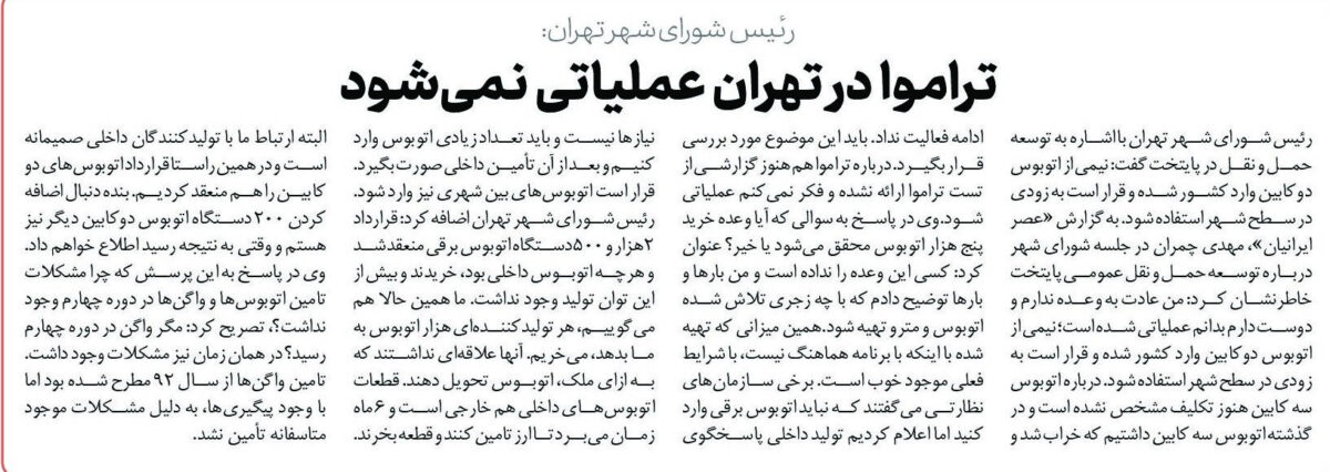 رئیس شورای شهر تهران با اشاره به توسعه حمل و نقل در پایتخت گفت: نیمی از اتوبوس دوکابین وارد کشور شده و قرار است به زودی در سطح شهر استفاده شود. به گزارش «عصر ایرانیان»، مهدی چمران در جلسه شورای شهر درباره توسعه حمل و نقل عمومی پایتخت خاطرنشان کرد: من عادت به وعده ندارم و دوست دارم بدانم عملیاتی شده است؛ نیمی از اتوبوس دوکابین وارد کشور شده و قرار است به زودی در سطح شهر استفاده شود. درباره اتوبوس سه کابین هنوز تکلیف مشخص نشده است و در گذشته اتوبوس سه کابین داشتیم که خراب شد و ادامه فعالیت نداد. باید این موضوع مورد بررسی قرار بگیرد. درباره تراموا هم هنوز گزارشی از تست تراموا ارائه نشده و فکر نمی‌کنم عملیاتی شود.وی در پاسخ به سوالی که آیا وعده خرید پنج هزار اتوبوس محقق می‌شود یا خیر؟ عنوان کرد: کسی این وعده را نداده است و من بارها و بارها توضیح دادم که با چه زجری تلاش شده اتوبوس و مترو تهیه شود.همین میزانی که تهیه شده با اینکه با برنامه هماهنگ نیست، با شرایط فعلی موجود خوب است. برخی سازمان‌های نظارتی می‌گفتند که نباید اتوبوس برقی وارد کنید اما اعلام کردیم تولید داخلی پاسخگوی نیازها نیست و باید تعداد زیادی اتوبوس وارد کنیم و بعد از آن تأمین داخلی صورت بگیرد. قرار است اتوبوس‌های بین شهری نیز وارد شود.رئیس شورای شهر تهران اضافه کرد: قرارداد ۲ هزار و ۵۰۰ دستگاه اتوبوس برقی منعقد شد و هرچه اتوبوس داخلی بود، خریدند و بیش از این توان تولید وجود نداشت. ما همین حالا هم می‌گوییم، هر تولیدکننده‌ای هزار اتوبوس به ما بدهد، می‌خریم. آنها علاقه‌ای نداشتند که به ازای ملک، اتوبوس تحویل دهند. قطعات اتوبوس‌های داخلی هم خارجی است و ۶ ماه زمان می‌برد تا ارز تامین کنند و قطعه بخرند. البته ارتباط ما با تولیدکنندگان داخلی صمیمانه است و در همین راستا قرارداد اتوبوس‌های دو کابین را هم منعقد کردیم. بنده دنبال اضافه کردن ۲۰۰ دستگاه اتوبوس دوکابین دیگر نیز هستم و وقتی به نتیجه رسید اطلاع خواهم داد.وی در پاسخ به این پرسش که چرا مشکلات تامین اتوبوس‌ها و واگن‌ها در دوره چهارم وجود نداشت؟، تصریح کرد: مگر واگن در دوره چهارم رسید؟ در همان زمان نیز مشکلات وجود داشت. تامین واگن‌ها از سال ۹۲ مطرح شده بود اما با وجود پیگیری‌ها، به دلیل مشکلات موجود متاسفانه تأمین نشد.