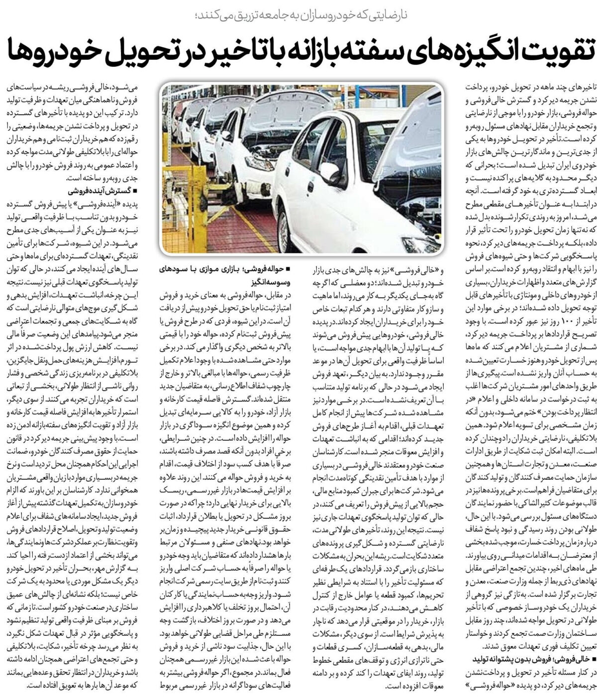 پدیده «آینده‌فروشی» یا پیش‌فروش گسترده خودرو بدون تناسب با ظرفیت واقعی تولید نیز به عنوان یکی از آسیب‌های جدی مطرح می‌شود. در این شیوه، شرکت‌ها برای تأمین نقدینگی، تعهدات گسترده‌ای برای ماه‌ها و حتی سال‌های آینده ایجاد می‌کنند، در حالی که توان تولید پاسخگوی تعهدات قبلی نیز نیست. نتیجه این چرخه، انباشت تعهدات، افزایش بدهی و شکل‌گیری موج‌های متوالی نارضایتی است که گاه به شکایت‌های جمعی و تجمعات اعتراضی منجر می‌شود.پیامدهای این وضعیت صرفاً مالی نیست. کاهش ارزش پول پرداخت‌شده در اثر تورم، افزایش هزینه‌های حمل‌ونقل جایگزین، بلاتکلیفی در برنامه‌ریزی زندگی شخصی و فشار روانی ناشی از انتظار طولانی، بخشی از تبعاتی است که خریداران تجربه می‌کنند. از سوی دیگر، استمرار تأخیرها به افزایش فاصله قیمت کارخانه و بازار آزاد و تقویت انگیزه‌های سفته‌بازانه ادمن زده است.با وجود پیش‌بینی جریمه دیرکرد در قانون حمایت از حقوق مصرف‌کنندگان خودرو، ضمانت اجرایی این احکام همچنان محل تردید است و نرخ جریمه در بسیاری موارد با زیان واقعی مشتریان همخوانی ندارد. کارشناسان بر این باورند که الزام خودروسازان به تکمیل تعهدات گذشته پیش از آغاز فروش جدید، ایجاد سامانه‌های شفاف برای اعلام وضعیت تولید و تحویل، اصلاح قراردادهای فروش و تقویت نظارت بر عملکرد شرکت‌ها و نمایندگی‌ها، می‌تواند بخشی از اعتماد ازدست‌رفته را احیا کند.به گزارش مهر، بحران تأخیر در تحویل خودرو دیگر یک مشکل موردی یا محدود به یک شرکت خاص نیست؛ بلکه نشانه‌ای از چالش‌های عمیق ساختاری در صنعت خودرو کشور است.تا زمانی که فروش بر مبنای ظرفیت واقعی تولید تنظیم نشود و پاسخگویی مؤثر در قبال تعهدات شکل نگیرد، به نظر می‌رسد چرخه تأخیر، شکایت، بلاتکلیفی و حتی تجمع‌های اعتراضی همچنان ادامه داشته باشد و خریداران در انتظار تحقق وعده‌هایی بمانند که موعد آن‌ها بارها به تعویق افتاده است.