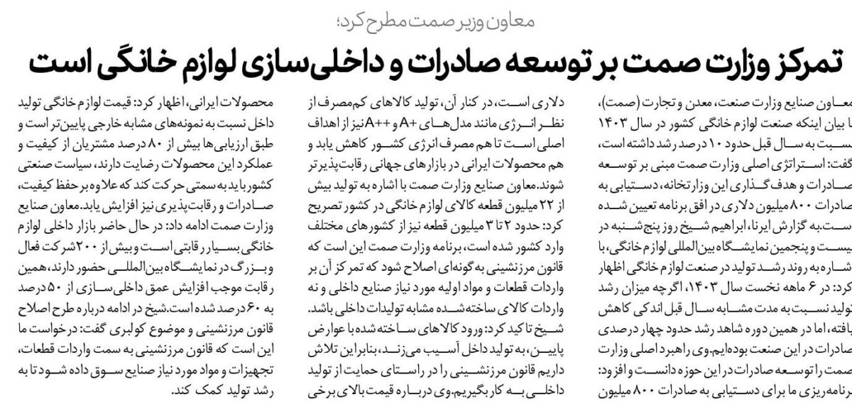 معاون صنایع وزارت صنعت، معدن و تجارت (صمت)، با بیان اینکه صنعت لوازم خانگی کشور در سال ۱۴۰۳ نسبت به سال قبل حدود ۱۰ درصد رشد داشته است، گفت: استراتژی اصلی وزارت صمت مبنی بر توسعه صادرات و هدفگذاری این وزارتخانه، دستیابی به صادرات ۸۰۰ میلیون دلاری در افق برنامه تعیین شده است.به گزارش ایرنا، ابراهیم شیخ روز پنجشنبه در بیست و پنجمین نمایشگاه بینالمللی لوازم خانگی، با اشاره به روند رشد تولید در صنعت لوازم خانگی اظهار کرد: در ۶ ماهه نخست سال ۱۴۰۳، اگرچه میزان رشد تولید نسبت به مدت مشابه سال قبل اندکی کاهش یافته، اما در همین دوره شاهد رشد حدود چهار درصدی صادرات در این صنعت بودهایم.وی راهبرد اصلی وزارت صمت را توسعه صادرات در این حوزه دانست و افزود: برنامهریزی ما برای دستیابی به صادرات ۸۰۰ میلیون دلاری است، در کنار آن، تولید کالاهای کممصرف از نظر انرژی مانند مدلهای +A و ++A نیز از اهداف اصلی است تا هم مصرف انرژی کشور کاهش یابد و هم محصولات ایرانی در بازارهای جهانی رقابتپذیرتر شوند.معاون صنایع وزارت صمت با اشاره به تولید بیش از ۲۲ میلیون قطعه کالای لوازم خانگی در کشور تصریح کرد: حدود ۲ تا ۳ میلیون قطعه نیز از کشورهای مختلف وارد کشور شده است، برنامه وزارت صمت این است که قانون مرزنشینی بهگونهای اصلاح شود که تمرکز آن بر واردات قطعات و مواد اولیه مورد نیاز صنایع داخلی و نه واردات کالای ساختهشده مشابه تولیدات داخلی باشد.شیخ تاکید کرد: ورود کالاهای ساخته شده با عوارض پایین، به تولید داخل آسیب میزند، بنابراین تلاش داریم قانون مرزنشینی را در راستای حمایت از تولید داخلی به کار بگیریم.وی درباره قیمت بالای برخی محصولات ایرانی، اظهار کرد: قیمت لوازم خانگی تولید داخل نسبت به نمونههای مشابه خارجی پایینتر است و طبق ارزیابیها بیش از ۸۰ درصد مشتریان از کیفیت و عملکرد این محصولات رضایت دارند، سیاست صنعتی کشور باید به سمتی حرکت کند که علاوه بر حفظ کیفیت، صادرات و رقابتپذیری نیز افزایش یابد.معاون صنایع وزارت صمت ادامه داد: در حال حاضر بازار داخلی لوازم خانگی بسیار رقابتی است و بیش از ۲۰۰ شرکت فعال و بزرگ در نمایشگاه بینالمللی حضور دارند، همین رقابت موجب افزایش عمق داخلیسازی از ۵۰ درصد به ۶۰ درصد شده است.شیخ در ادامه درباره طرح اصلاح قانون مرزنشینی و موضوع کولبری گفت: درخواست ما این است که قانون مرزنشینی به سمت واردات قطعات، تجهیزات و مواد مورد نیاز صنایع سوق داده شود تا به رشد تولید کمک کند.