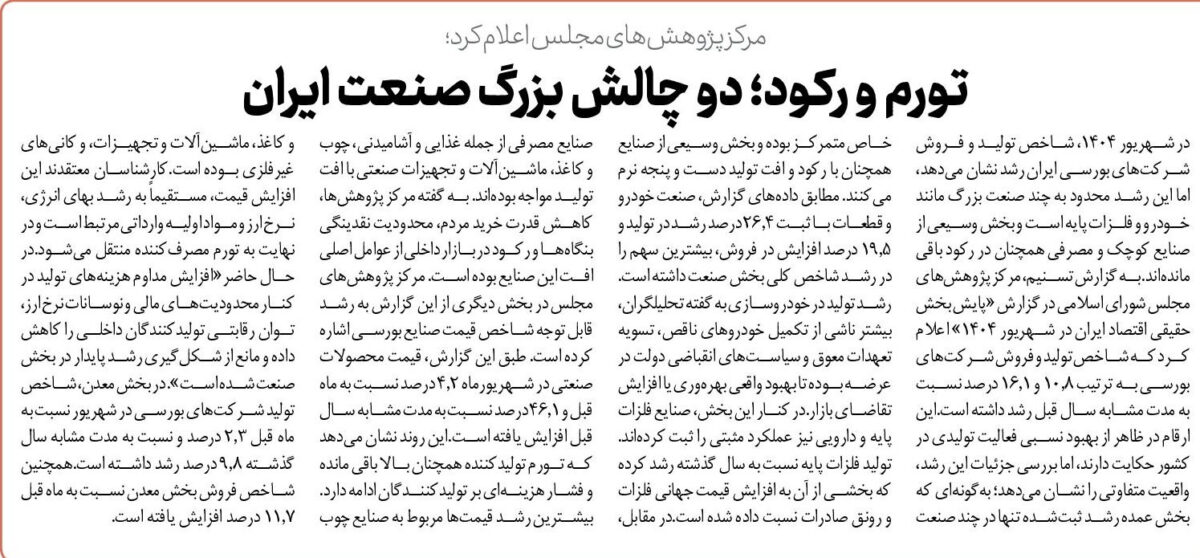 در شهریور 1404، شاخص تولید و فروش شرکتهای بورسی ایران رشد نشان میدهد، اما این رشد محدود به چند صنعت بزرگ مانند خودرو و فلزات پایه است و بخش وسیعی از صنایع کوچک و مصرفی همچنان در رکود باقی ماندهاند.به گزارش تسنیم، مرکز پژوهشهای مجلس شورای اسلامی در گزارش «پایش بخش حقیقی اقتصاد ایران در شهریور 1404» اعلام کرد که شاخص تولید و فروش شرکتهای بورسی به ترتیب 10.8 و 16.1 درصد نسبت به مدت مشابه سال قبل رشد داشته است.این ارقام در ظاهر از بهبود نسبی فعالیت تولیدی در کشور حکایت دارند، اما بررسی جزئیات این رشد، واقعیت متفاوتی را نشان میدهد؛ بهگونهای که بخش عمده رشد ثبتشده تنها در چند صنعت خاص متمرکز بوده و بخش وسیعی از صنایع همچنان با رکود و افت تولید دست و پنجه نرم میکنند. مطابق دادههای گزارش، صنعت خودرو و قطعات با ثبت 26.4 درصد رشد در تولید و 19.5 درصد افزایش در فروش، بیشترین سهم را در رشد شاخص کلی بخش صنعت داشته است.رشد تولید در خودروسازی به گفته تحلیلگران، بیشتر ناشی از تکمیل خودروهای ناقص، تسویه تعهدات معوق و سیاستهای انقباضی دولت در عرضه بوده تا بهبود واقعی بهرهوری یا افزایش تقاضای بازار.در کنار این بخش، صنایع فلزات پایه و دارویی نیز عملکرد مثبتی را ثبت کردهاند. تولید فلزات پایه نسبت به سال گذشته رشد کرده که بخشی از آن به افزایش قیمت جهانی فلزات و رونق صادرات نسبت داده شده است.در مقابل، صنایع مصرفی از جمله غذایی و آشامیدنی، چوب و کاغذ، ماشینآلات و تجهیزات صنعتی با افت تولید مواجه بودهاند. به گفته مرکز پژوهشها، کاهش قدرت خرید مردم، محدودیت نقدینگی بنگاهها و رکود در بازار داخلی از عوامل اصلی افت این صنایع بوده است. مرکز پژوهشهای مجلس در بخش دیگری از این گزارش به رشد قابل توجه شاخص قیمت صنایع بورسی اشاره کرده است. طبق این گزارش، قیمت محصولات صنعتی در شهریورماه 4.2 درصد نسبت به ماه قبل و 46.1 درصد نسبت به مدت مشابه سال قبل افزایش یافته است.این روند نشان میدهد که تورم تولیدکننده همچنان بالا باقی مانده و فشار هزینهای بر تولیدکنندگان ادامه دارد. بیشترین رشد قیمتها مربوط به صنایع چوب و کاغذ، ماشینآلات و تجهیزات، و کانیهای غیرفلزی بوده است.کارشناسان معتقدند این افزایش قیمت، مستقیماً به رشد بهای انرژی، نرخ ارز و مواد اولیه وارداتی مرتبط است و در نهایت به تورم مصرفکننده منتقل میشود.در حال حاضر«افزایش مداوم هزینههای تولید در کنار محدودیتهای مالی و نوسانات نرخ ارز، توان رقابتی تولیدکنندگان داخلی را کاهش داده و مانع از شکلگیری رشد پایدار در بخش صنعت شده است». در بخش معدن، شاخص تولید شرکتهای بورسی در شهریور نسبت به ماه قبل 2.3 درصد و نسبت به مدت مشابه سال گذشته 9.8 درصد رشد داشته است.همچنین شاخص فروش بخش معدن نسبت به ماه قبل 11.7 درصد افزایش یافته است.