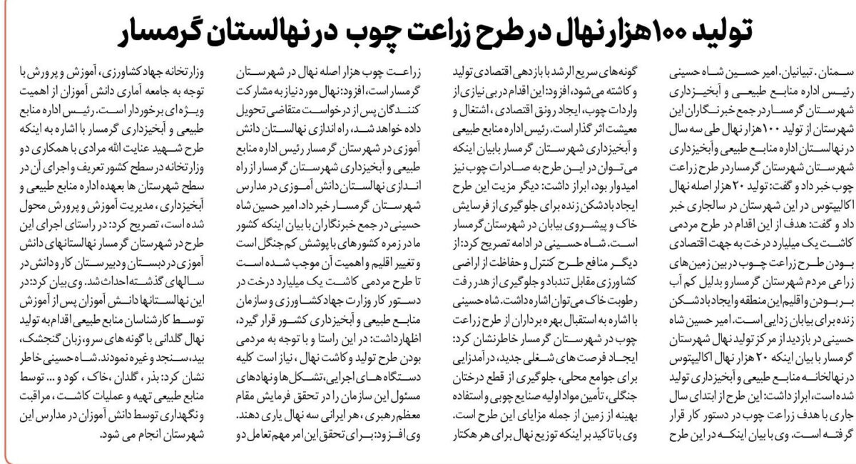 سمنان . تبیانیان. امیر حسین شاه حسینی رئیس اداره منابع طبیعی و آبخیزداری شهرستان گرمساردر جمع خبرنگاران این شهرستان از تولید ۱۰۰هزار نهال طی سه سال در نهالستان اداره منابع طبیعی وآبخیزداری شهرستان شهرستان گرمساردر طرح زراعت چوب خبر داد و گفت: تولید ۲۰ هزار اصله نهال اکالیپتوس در این شهرستان در سالجاری خبر داد و گفت: هدف از این اقدام در طرح مردمی کاشت یک میلیارد درخت به جهت اقتصادی بودن طرح زراعت چوب در بین زمینهای زراعی مردم شهرستان گرمسارو بدلیل کم آب بر بودن و اقلیم این منطقه و ایجاد بادشکن زنده برای بیابان زدایی است. امیر حسین شاه حسینی در بازدید از مرکز تولید نهال شهرستان گرمسار با بیان اینکه ۲۰ هزار نهال اکالیپتوس در نهالخانه منابع طبیعی و آبخیزداری تولید شده است، ابراز داشت: این طرح از ابتدای سال جاری با هدف زراعت چوب در دستور کار قرار گرفته است. وی با بیان اینکه در این طرح گونههای سریع الرشد با بازدهی اقتصادی تولید و کاشته میشود، افزود: این اقدام در بی نیازی از واردات چوب، ایجاد رونق اقتصادی ، اشتغال و معیشت اثر گذار است. رئیس اداره منابع طبیعی و آبخیزداری شهرستان گرمسار بابیان اینکه میتوان در این طرح به صادرات چوب نیز امیدوار بود، ابراز داشت: دیگر مزیت این طرح ایجاد بادشکن زنده برای جلوگیری از فرسایش خاک و پیشروی بیابان در شهرستانگرمسار است. شاه حسینی در ادامه تصریح کرد: از دیگر منافع طرح کنترل و حفاظت از اراضی کشاورزی مقابل تندباد و جلوگیری از هدر رفت رطوبت خاک میتوان اشاره داشت. شاه حسینی با اشاره به استقبال بهره برداران از طرح زراعت چوب در شهرستان گرمسار خاطرنشان کرد: ایجاد فرصت های شغلی جدید، درآمدزایی برای جوامع محلی، جلوگیری از قطع درختان جنگلی، تأمین مواد اولیه صنایع چوبی و استفاده بهینه از زمین از جمله مزایای این طرح است. وی با تاکید بر اینکه توزیع نهال برای هر هکتار زراعت چوب هزار اصله نهال در شهرستان گرمسار است، افزود: نهال مورد نیاز به مشارکت کنندگان پس از درخواست متقاضی تحویل داده خواهد شد، راه اندازی نهالستان دانش آموزی در شهرستان گرمسار رئیس اداره منابع طبیعی و آبخیزداری شهرستان گرمسار از راه اندازی نهالستان دانش آموزی در مدارس شهرستان گرمسار خبر داد. امیر حسین شاه حسینی در جمع خبرنگاران با بیان اینکه کشور ما در زمره کشورهای با پوشش کم جنگل است و تغییر اقلیم و اهمیت آن موجب شده است تا طرح مردمی کاشت یک میلیارد درخت در دستور کار وزارت جهادکشاورزی و سازمان منابع طبیعی و آبخیزداری کشور قرار گیرد، اظهارداشت: در این راستا و با توجه به مردمی بودن طرح تولید وکاشت نهال ، نیاز است کلیه دستگاه های اجرایی،تشکلها و نهادهای مسئول این سازمان را در تحقق فرمایش مقام معظم رهبری ، هر ایرانی سه نهال یاری دهند. وی افزود: برای تحقق این امر مهم تعامل دو وزارتخانه جهادکشاورزی، آموزش و پرورش با توجه به جامعه آماری دانش آموزان از اهمیت ویژه ای برخوردار است. رئیس اداره منابع طبیعی و آبخیزداری گرمسار با اشاره به اینکه طرح شهید عنایت الله مرادی با همکاری دو وزارتخانه در سطح کشور تعریف و اجرای آن در سطح شهرستان ها بعهده اداره منابع طبیعی و آبخیزداری ، مدیریت آموزش و پرورش محول شده است، تصریح کرد: در راستای اجرای این طرح در شهرستان گرمسار نهالستانهای دانش آموزی در دبستان و دبیرستان کار و دانش در سالهای گذشته احداث شد. وی بیان کرد: در این نهالستانها دانش آموزان پس از آموزش توسط کارشناسان منابع طبیعی اقدام به تولید نهال گلدانی با گونه های سرو، زبان گنجشک، بید، سنجد و غیره نمودند. شاه حسینی خاطر نشان کرد: بذر ، گلدان ،خاک ، کود و … توسط منابع طبیعی تهیه و عملیات کاشت ، مراقبت و نگهداری توسط دانش آموزان در مدارس این شهرستان انجام می شود.