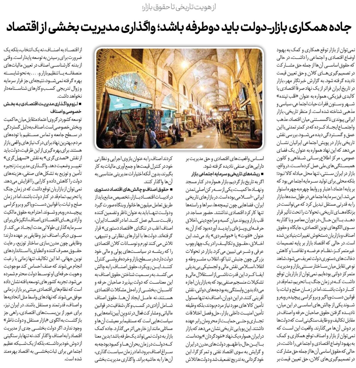 اگر به تاریخ بازگردیم، بازار همواره در کنار مسجد و نهاد حاکمیت، یکی از سه رکن اصلی تمدن ایرانی-اسلامی بوده است. در بازارهای تاریخی ایران، فضاهایی چون تیمچه‌ها، سراها و راسته‌ها تنها کارکرد اقتصادی نداشتند. حضور مساجد در قلب بازار و پیوند میان کسبه و مراجع دینی، اخلاق حرفه‌ای ویژه‌ای را پدید آورده بود که از آن به عنوان «فتوت» یا «جوانمردی» یاد می‌شد. این اخلاق، حقوق و تکالیف را در یک چهارچوب عرفی و شرعی تبیین می‌کرد. بازار در تحولات بزرگی چون جنبش تنباکو، انقلاب مشروطه و انقلا، اسلامی نقش مالی و لجستیکی بی‌بدیلی ایفا کرد. این قدرت ناشی از استقلال مالی و تشکیلات منسجم صنفی بود که به بازاریان اجازه می‌داد بدون وابستگی به بودجه‌های دولتی، نقش آفرینی کنند. در این دوران، اصناف نه تنها مسئول تأمین کالاهای مورد نیاز مردم بودند، بلکه وظیفه تأمین امنیت داخلی بازار، حل‌وفصل اختلافات تجاری و حتی حمایت از محرومان را بر عهده داشتند. این پویایی تاریخی نشان می‌دهد که بازار در ایران همواره یک نهاد «خودگردان» بوده است. با این حال، با ظهور دولت‌های مدرن در ایران و گرایش به سوی اقتصاد نفتی و تمرکزگرا، این خودگردانی به تدریج تضعیف شد و دولت‌ها تلاش کردند اصناف را به عنوان بازوی اجرایی و نظارتی خود در کنترل قیمت‌ها و جمع‌آوری مالیات به کار بگیرند، بدون آنکه اختیارات مدیریتی متناسبی به آن‌ها واگذار کنند.