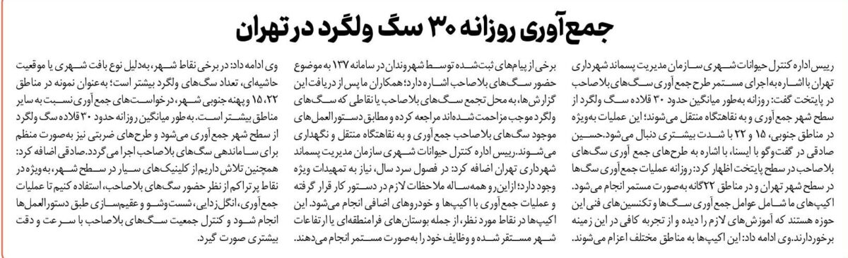 رییس اداره کنترل حیوانات شهری سازمان مدیریت پسماند شهرداری تهران با اشاره به اجرای مستمر طرح جمعآوری سگهای بلاصاحب در پایتخت گفت: روزانه بهطور میانگین حدود ۳۰ قلاده سگ ولگرد از سطح شهر جمعآوری و به نقاهتگاه منتقل میشوند؛ این عملیات بهویژه در مناطق جنوبی، ۱۵ و ۲۲ با شدت بیشتری دنبال میشود.حسین صادقی در گفتوگو با ایسنا، با اشاره به طرحهای جمع آوری سگهای بلاصاحب در سطح پایتخت اظهار کرد: روزانه عملیات جمعآوری سگها در سطح شهر تهران و در مناطق ۲۲گانه بهصورت مستمر انجام میشود. اکیپهای ما شامل عوامل جمعآوری سگها و تکنسینهای فنی این حوزه هستند که آموزشهای لازم را دیده و از تجربه کافی در این زمینه برخوردارند.وی ادامه داد: این اکیپها به مناطق مختلف اعزام میشوند. برخی از پیامهای ثبتشده توسط شهروندان در سامانه ۱۳۷ به موضوع حضور سگهای بلاصاحب اشاره دارد؛ همکاران ما پس از دریافت این گزارشها، به محل تجمع سگهای بلاصاحب یا نقاطی که سگهای ولگرد موجب مزاحمت شدهاند مراجعه کرده و مطابق دستورالعملهای موجود سگهای بلاصاحب جمعآوری و به نقاهتگاه منتقل و نگهداری میشوند.رییس اداره کنترل حیوانات شهری سازمان مدیریت پسماند شهرداری تهران اضافه کرد: در فصول سرد سال، نیاز به تمهیدات ویژه وجود دارد؛ ازاینرو همهساله ملاحظات لازم در دستور کار قرار گرفته و عملیات جمعآوری با اکیپها و خودروهای اضافی انجام میشود. این اکیپها در نقاط مورد نظر، از جمله بوستانهای فرامنطقهای یا ارتفاعات شهر مستقر شده و وظایف خود را بهصورت مستمر انجام میدهند.وی ادامه داد: در برخی نقاط شهر، بهدلیل نوع بافت شهری یا موقعیت حاشیهای، تعداد سگهای ولگرد بیشتر است؛ بهعنوان نمونه در مناطق ۲۲، ۱۵ و پهنه جنوبی شهر، درخواستهای جمعآوری نسبت به سایر مناطق بیشتر است. بهطور میانگین روزانه حدود ۳۰ قلاده سگ ولگرد از سطح شهر جمعآوری میشود و طرحهای ضربتی نیز بهصورت منظم برای ساماندهی سگهای بلاصاحب اجرا میگردد.صادقی اضافه کرد: همچنین تلاش داریم از کلینیکهای سیار در سطح شهر، بهویژه در نقاط پرتراکم از نظر حضور سگهای بلاصاحب، استفاده کنیم تا عملیات جمعآوری، انگلزدایی، شستوشو و عقیمسازی طبق دستورالعملها انجام شود و کنترل جمعیت سگهای بلاصاحب با سرعت و دقت بیشتری صورت گیرد.