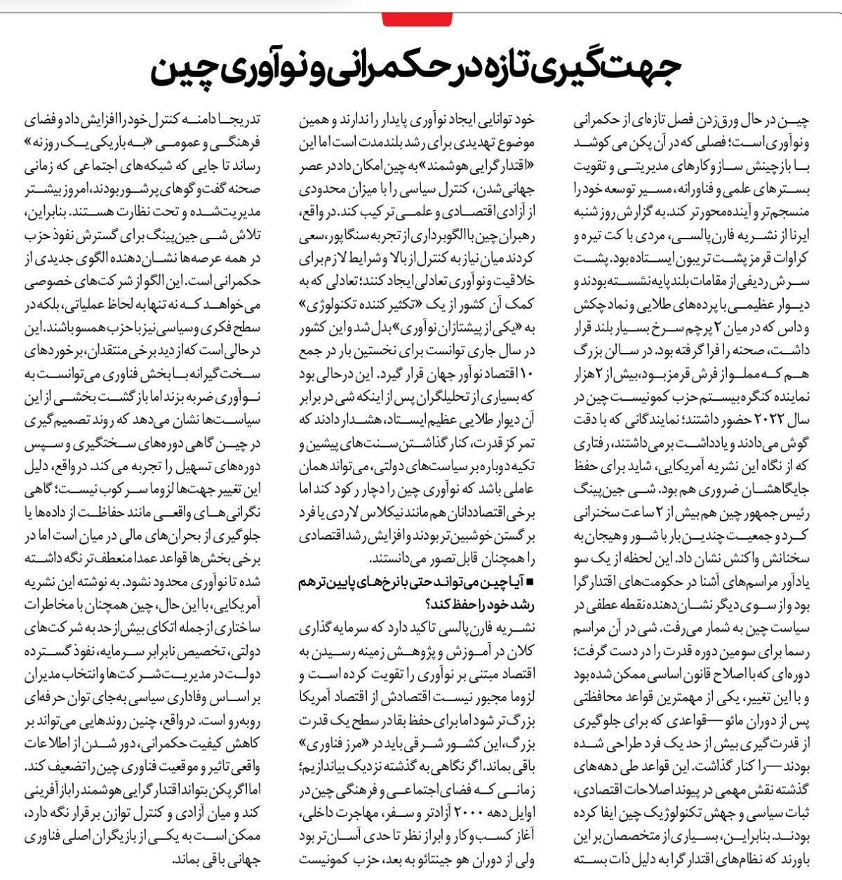 نشریه فارنپالسی تاکید دارد که سرمایهگذاری کلان در آموزش و پژوهش زمینه رسیدن به اقتصاد مبتنی بر نوآوری را تقویت کرده است و لزوما مجبور نیست اقتصادش از اقتصاد آمریکا بزرگتر شود اما برای حفظ بقا در سطح یک قدرت بزرگ، این کشور شرقی باید در «مرز فناوری» باقی بماند. اگر نگاهی به گذشته نزدیک بیاندازیم؛ زمانی که فضای اجتماعی و فرهنگی چین در اوایل دهه ۲۰۰۰ آزادتر و سفر، مهاجرت داخلی، آغاز کسبوکار و ابراز نظر تا حدی آسانتر بود ولی از دوران هو جینتائو به بعد، حزب کمونیست تدریجا دامنه کنترل خود را افزایش داد و فضای فرهنگی و عمومی «به باریکی یک روزنه» رساند تا جایی که شبکههای اجتماعی که زمانی صحنه گفتوگوهای پرشور بودند، امروز بیشتر مدیریتشده و تحت نظارت هستند. بنابراین، تلاش شی جینپینگ برای گسترش نفوذ حزب در همه عرصهها نشاندهنده الگوی جدیدی از حکمرانی است. این الگو از شرکتهای خصوصی میخواهد که نه تنها به لحاظ عملیاتی، بلکه در سطح فکری و سیاسی نیز با حزب همسو باشند. این درحالی است که از دید برخی منتقدان، برخوردهای سختگیرانه با بخش فناوری میتوانست به نوآوری ضربه بزند اما بازگشت بخشی از این سیاستها نشان میدهد که روند تصمیمگیری در چین گاهی دورههای سختگیری و سپس دورههای تسهیل را تجربه میکند. درواقع، دلیل این تغییر جهتها لزوما سرکوب نیست؛ گاهی نگرانیهای واقعی مانند حفاظت از دادهها یا جلوگیری از بحرانهای مالی در میان است اما در برخی بخشها قواعد عمدا منعطفتر نگه داشته شده تا نوآوری محدود نشود. به نوشته این نشریه آمریکایی، با این حال، چین همچنان با مخاطرات ساختاری ازجمله اتکای بیشازحد به شرکتهای دولتی، تخصیص نابرابر سرمایه، نفوذ گسترده دولت در مدیریت شرکتها و انتخاب مدیران بر اساس وفاداری سیاسی بهجای توان حرفهای روبهرو است. درواقع، چنین روندهایی میتواند بر کاهش کیفیت حکمرانی، دور شدن از اطلاعات واقعی تاثیر و موقعیت فناوری چین را تضعیف کند. اما اگر پکن بتواند اقتدارگرایی هوشمند را بازآفرینی کند و میان آزادی و کنترل توازن برقرار نگه دارد، ممکن است به یکی از بازیگران اصلی فناوری جهانی باقی بماند.