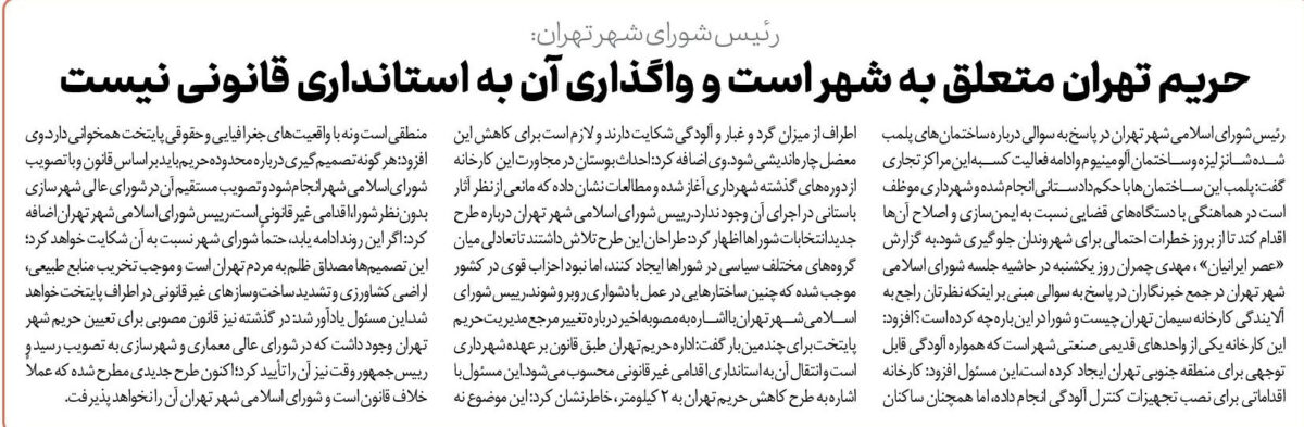 رئیس شورای اسلامی شهر تهران در پاسخ به سوالی درباره ساختمانهای پلمب شده شانزلیزه و ساختمان آلومینیوم و ادامه فعالیت کسبه این مراکز تجاری گفت: پلمب این ساختمانها با حکم دادستانی انجام شده و شهرداری موظف است در هماهنگی با دستگاههای قضایی نسبت به ایمنسازی و اصلاح آنها اقدام کند تا از بروز خطرات احتمالی برای شهروندان جلوگیری شود.به گزارش «عصر ایرانیان» ، مهدی چمران روز یکشنبه در حاشیه جلسه شورای اسلامی شهر تهران در جمع خبرنگاران در پاسخ به سوالی مبنی بر اینکه نظرتان راجع به آلایندگی کارخانه سیمان تهران چیست و شورا در این باره چه کرده است ؟ افزود: این کارخانه یکی از واحدهای قدیمی صنعتی شهر است که همواره آلودگی قابل توجهی برای منطقه جنوبی تهران ایجاد کرده است.این مسئول افزود: کارخانه اقداماتی برای نصب تجهیزات کنترل آلودگی انجام داده، اما همچنان ساکنان اطراف از میزان گرد و غبار و آلودگی شکایت دارند و لازم است برای کاهش این معضل چارهاندیشی شود.وی اضافه کرد: احداث بوستان در مجاورت این کارخانه از دورههای گذشته شهرداری آغاز شده و مطالعات نشان داده که مانعی از نظر آثار باستانی در اجرای آن وجود ندارد.رییس شورای اسلامی شهر تهران درباره طرح جدید انتخابات شوراها اظهار کرد: طراحان این طرح تلاش داشتند تا تعادلی میان گروههای مختلف سیاسی در شوراها ایجاد کنند، اما نبود احزاب قوی در کشور موجب شده که چنین ساختارهایی در عمل با دشواری روبرو شوند.رییس شورای اسلامی شهر تهران با اشاره به مصوبه اخیر درباره تغییر مرجع مدیریت حریم پایتخت برای چندمین بار گفت: اداره حریم تهران طبق قانون بر عهده شهرداری است و انتقال آن به استانداری اقدامی غیرقانونی محسوب میشود.این مسئول با اشاره به طرح کاهش حریم تهران به ۲ کیلومتر، خاطرنشان کرد: این موضوع نه منطقی است و نه با واقعیتهای جغرافیایی و حقوقی پایتخت همخوانی دارد.وی افزود: هرگونه تصمیمگیری درباره محدوده حریم باید بر اساس قانون و با تصویب شورای اسلامی شهر انجام شود و تصویب مستقیم آن در شورای عالی شهرسازی بدون نظر شورا، اقدامی غیرقانونی است.رییس شورای اسلامی شهر تهران اضافه کرد: اگر این روند ادامه یابد، حتماً شورای شهر نسبت به آن شکایت خواهد کرد؛ این تصمیمها مصداق ظلم به مردم تهران است و موجب تخریب منابع طبیعی، اراضی کشاورزی و تشدید ساختوسازهای غیرقانونی در اطراف پایتخت خواهد شد.این مسئول یادآور شد: در گذشته نیز قانون مصوبی برای تعیین حریم شهر تهران وجود داشت که در شورای عالی معماری و شهرسازی به تصویب رسید و رییسجمهور وقت نیز آن را تأیید کرد؛ اکنون طرح جدیدی مطرح شده که عملاً خلاف قانون است و شورای اسلامی شهر تهران آن را نخواهد پذیرفت.