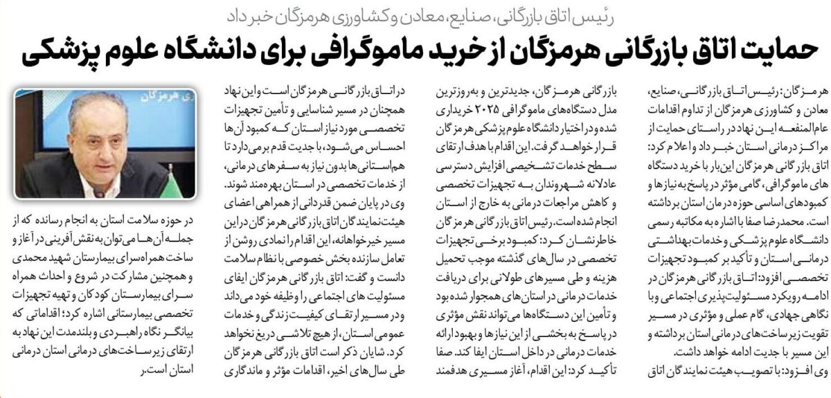 وی افزود: با تصویب هیئت نمایندگان اتاق بازرگانی هرمزگان، جدیدترین و بهروزترین مدل دستگاههای ماموگرافی ۲۰۲۵ خریداری شده و در اختیار دانشگاه علوم پزشکی هرمزگان قرار خواهد گرفت. این اقدام با هدف ارتقای سطح خدمات تشخیصی افزایش دسترسی عادلانه شهروندان به تجهیزات تخصصی و کاهش مراجعات درمانی به خارج از استان انجام شده است. رئیس اتاق بازرگانی هرمزگان خاطرنشان کرد: کمبود برخی تجهیزات تخصصی در سالهای گذشته موجب تحمیل هزینه و طی مسیرهای طولانی برای دریافت خدمات درمانی در استانهای همجوار شده بود و تأمین این دستگاهها میتواند نقش مؤثری در پاسخ به بخشی از این نیازها و بهبود ارائه خدمات درمانی در داخل استان ایفا کند. صفا تأکید کرد: این اقدام، آغاز مسیری هدفمند در اتاق بازرگانی هرمزگان است و این نهاد همچنان در مسیر شناسایی و تأمین تجهیزات تخصصی مورد نیاز استان که کمبود آنها احساس میشود، با جدیت قدم برمیدارد تا هماستانیها بدون نیاز به سفرهای درمانی، از خدمات تخصصی در استان بهرهمند شوند. وی در پایان ضمن قدردانی از همراهی اعضای هیئت نمایندگان اتاق بازرگانی هرمزگان در این مسیر خیرخواهانه، این اقدام را نمادی روشن از تعامل سازنده بخش خصوصی با نظام سلامت دانست و گفت: اتاق بازرگانی هرمزگان ایفای مسئولیت های اجتماعی را وظیفه خود میداند و در مسیر ارتقای کیفیت زندگی و خدمات عمومی استان، از هیچ تلاشی دریغ نخواهد کرد. شایان ذکر است اتاق بازرگانی هرمزگان طی سالهای اخیر، اقدامات مؤثر و ماندگاری در حوزه سلامت استان به انجام رسانده که از جمله آنها میتوان به نقشآفرینی در آغاز و ساخت همراهسرای بیمارستان شهید محمدی و همچنین مشارکت در شروع و احداث همراه سرای بیمارستان کودکان و تهیه تجهیزات تخصصی بیمارستانی اشاره کرد؛ اقداماتی که بیانگر نگاه راهبردی و بلندمدت این نهاد به ارتقای زیرساختهای درمانی استان درمانی استان است.ر