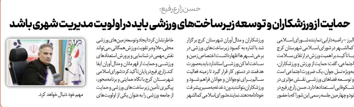 البرز – راضیه دارابی: نماینده شورای اسلامی کمالشهر در شورای اسلامی شهرستان کرج با تأکید بر اهمیت ورزش در ارتقای سلامت اجتماعی، گفت: حمایت از ورزش و ورزشکاران، بهویژه نسل جوان، یک ضرورت اجتماعی است و توسعه فضاهای ورزشی نقش مؤثری در شکوفایی استعدادها دارد. حسن زارع رفیع در نود و چهارمین جلسه رسمی این شورا که با حضور ورزشکاران و مدالآوران شهرستان کرج برگزار شد با اشاره به کمبود زیرساختهای ورزشی در برخی شهرها اظهارداشت: اختصاص زمین و ساخت اماکن ورزشی استاندارد باید بهصورت هدفمند در دستور کار قرار گیرد تا زمینه فعالیت سالم برای نوجوانان و جوانان فراهم شود و ورزشکاران بتوانند بدون دغدغه به مسیر پیشرفت خود ادامه دهند. نماینده شورای اسلامی کمالشهر خاطرنشان کرد: ایجاد و توسعه زمینهای ورزشی محلی، علاوه بر تقویت ورزش همگانی، میتواند نقش مهمی در شناسایی و پرورش استعدادهای ورزشی و حمایت از قهرمانان و مدالآوران ایفا کند. زارعرفیع در پایان تأکید کرد: شورای اسلامی شهرستان کرج با نگاه حمایتی و برنامهمحور، پیگیری تأمین زیرساختهای ورزشی و حمایت از جامعه ورزشی را بهعنوان یکی از اولویتهای مهم خود دنبال خواهد کرد.