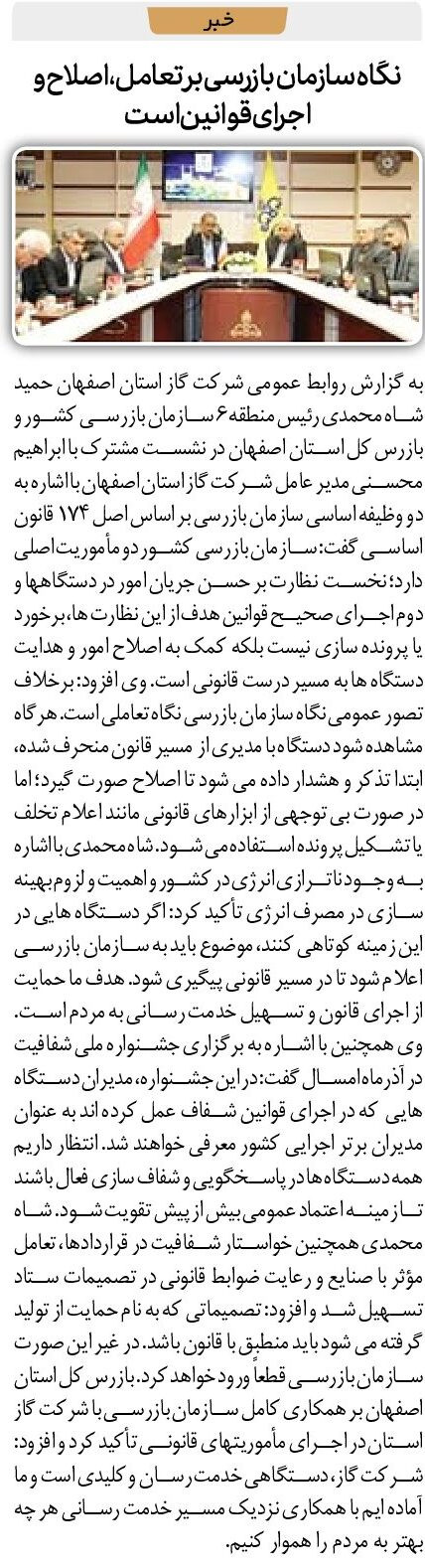 به گزارش روابط عمومی شرکت گاز استان اصفهان حمید شاه محمدی رئیس منطقه ۶ سازمان بازرسی کشور و بازرس کل استان اصفهان در نشست مشترک با ابراهیم محسنی مدیر عامل شرکت گاز استان اصفهان با اشاره به دو وظیفه اساسی سازمان بازرسی بر اساس اصل ۱۷۴ قانون اساسی گفت: سازمان بازرسی کشور دو مأموریت اصلی دارد؛ نخست نظارت بر حسن جریان امور در دستگاهها و دوم اجرای صحیح قوانین هدف از این نظارت ها، برخورد یا پرونده سازی نیست بلکه کمک به اصلاح امور و هدایت دستگاه ها به مسیر درست قانونی است. وی افزود: برخلاف تصور عمومی نگاه سازمان بازرسی نگاه تعاملی است. هرگاه مشاهده شود دستگاه با مدیری از مسیر قانون منحرف شده، ابتدا تذکر و هشدار داده می شود تا اصلاح صورت گیرد؛ اما در صورت بی توجهی از ابزارهای قانونی مانند اعلام تخلف یا تشکیل پرونده استفاده می شود. شاه محمدی با اشاره به وجود ناترازی انرژی در کشور و اهمیت و لزوم بهینه سازی در مصرف انرژی تأکید کرد: اگر دستگاه هایی در این زمینه کوتاهی کنند، موضوع باید به سازمان بازرسی اعلام شود تا در مسیر قانونی پیگیری شود. هدف ما حمایت از اجرای قانون و تسهیل خدمت رسانی به مردم است. وی همچنین با اشاره به برگزاری جشنواره ملی شفافیت در آذرماه امسال گفت: در این جشنواره، مدیران دستگاه هایی که در اجرای قوانین شفاف عمل کرده اند به عنوان مدیران برتر اجرایی کشور معرفی خواهند شد. انتظار داریم همه دستگاه ها در پاسخگویی و شفاف سازی فعال باشند تا زمینه اعتماد عمومی بیش از پیش تقویت شود. شاه محمدی همچنین خواستار شفافیت در قراردادها، تعامل مؤثر با صنایع و رعایت ضوابط قانونی در تصمیمات ستاد تسهیل شد و افزود: تصمیماتی که به نام حمایت از تولید گرفته می شود باید منطبق با قانون باشد. در غیر این صورت سازمان بازرسی قطعاً ورود خواهد کرد. بازرس کل استان اصفهان بر همکاری کامل سازمان بازرسی با شرکت گاز استان در اجرای مأموریتهای قانونی تأکید کرد و افزود: شرکت گاز، دستگاهی خدمت رسان و کلیدی است و ما آماده ایم با همکاری نزدیک مسیر خدمت رسانی هر چه بهتر به مردم را هموار کنیم.