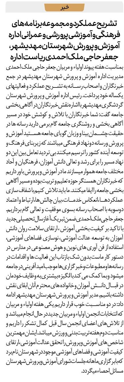 تشریح عملکرد و مجموعه برنامه های فرهنگی و آموزشی پرورشی و عمرانی اداره آموزش و پرورش شهرستان مهدیشهر ، جعفر حاجی ملک احمدی ریاست اداره