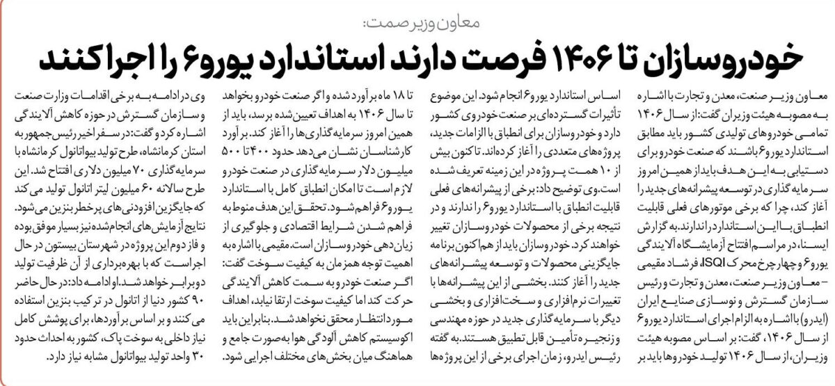 معاون وزیر صنعت، معدن و تجارت با اشاره به مصوبه هیئت وزیران گفت: از سال ۱۴۰۶ تمامی خودروهای تولیدی کشور باید مطابق استاندارد یورو۶ باشند که صنعت خودرو برای دستیابی به این هدف باید از همین امروز سرمایهگذاری در توسعه پیشرانههای جدید را آغاز کند، چرا که برخی موتورهای فعلی قابلیت انطباق با این استاندارد را ندارند.به گزارش ایسنا، در مراسم افتتاح آزمایشگاه آلایندگی یورو۶ و چهارچرخمحرک ISQI، فرشاد مقیمی – معاون وزیر صنعت، معدن و تجارت و رئیس سازمان گسترش و نوسازی صنایع ایران (ایدرو) با اشاره به الزام اجرای استاندارد یورو۶ از سال ۱۴۰۶، گفت: بر اساس مصوبه هیئت وزیران، از سال ۱۴۰۶ تولید خودروها باید بر اساس استاندارد یورو۶ انجام شود. این موضوع تأثیرات گستردهای بر صنعت خودروی کشور دارد و خودروسازان برای انطباق با الزامات جدید، پروژههای متعددی را آغاز کردهاند. تاکنون بیش از ۱۰ همت پروژه در این زمینه تعریف شده است.وی توضیح داد: برخی از پیشرانههای فعلی قابلیت انطباق با استاندارد یورو۶ را ندارند و در نتیجه برخی از محصولات خودروسازان تغییر خواهند کرد. خودروسازان باید از هماکنون برنامه جایگزینی محصولات و توسعه پیشرانههای جدید را آغاز کنند. بخشی از این پیشرانهها با تغییرات نرمافزاری و سختافزاری و بخشی دیگر با سرمایهگذاری جدید در حوزه مهندسی و زنجیره تأمین قابل تطبیق هستند.به گفته رئیس ایدرو، زمان اجرای برخی از این پروژهها تا ۱۸ ماه برآورد شده و اگر صنعت خودرو بخواهد تا سال ۱۴۰۶ به اهداف تعیینشده برسد، باید از همین امروز سرمایهگذاریها را آغاز کند. برآورد کارشناسان نشان میدهد حدود ۴۰۰ تا ۵۰۰ میلیون دلار سرمایهگذاری در صنعت خودرو لازم است تا امکان انطباق کامل با استاندارد یورو۶ فراهم شود. تحقق این هدف منوط به فراهم شدن شرایط اقتصادی و جلوگیری از زیاندهی خودروسازان است.مقیمی با اشاره به اهمیت توجه همزمان به کیفیت سوخت گفت: اگر صنعت خودرو به سمت کاهش آلایندگی حرکت کند اما کیفیت سوخت ارتقا نیابد، اهداف مورد انتظار محقق نخواهد شد. بنابراین باید اکوسیستم کاهش آلودگی هوا بهصورت جامع و هماهنگ میان بخشهای مختلف اجرایی شود.وی در ادامه به برخی اقدامات وزارت صنعت و سازمان گسترش در حوزه کاهش آلایندگی اشاره کرد و گفت: در سفر اخیر رئیسجمهور به استان کرمانشاه، طرح تولید بیواتانول کرمانشاه با سرمایهگذاری ۷۰ میلیون دلاری افتتاح شد. این طرح سالانه ۶۰ میلیون لیتر اتانول تولید میکند که جایگزین افزودنیهای پرخطر بنزین میشود. نتایج آزمایشهای انجامشده نیز بسیار موفق بوده و فاز دوم این پروژه در شهرستان بیستون در حال اجراست که با بهرهبرداری از آن ظرفیت تولید دو برابر خواهد شد.او ادامه داد: در حال حاضر ۹۰ کشور دنیا از اتانول در ترکیب بنزین استفاده میکنند و بر اساس برآوردها، برای پوشش کامل نیاز داخلی به سوخت پاک، کشور به احداث حدود ۳۰ واحد تولید بیواتانول مشابه نیاز دارد.
