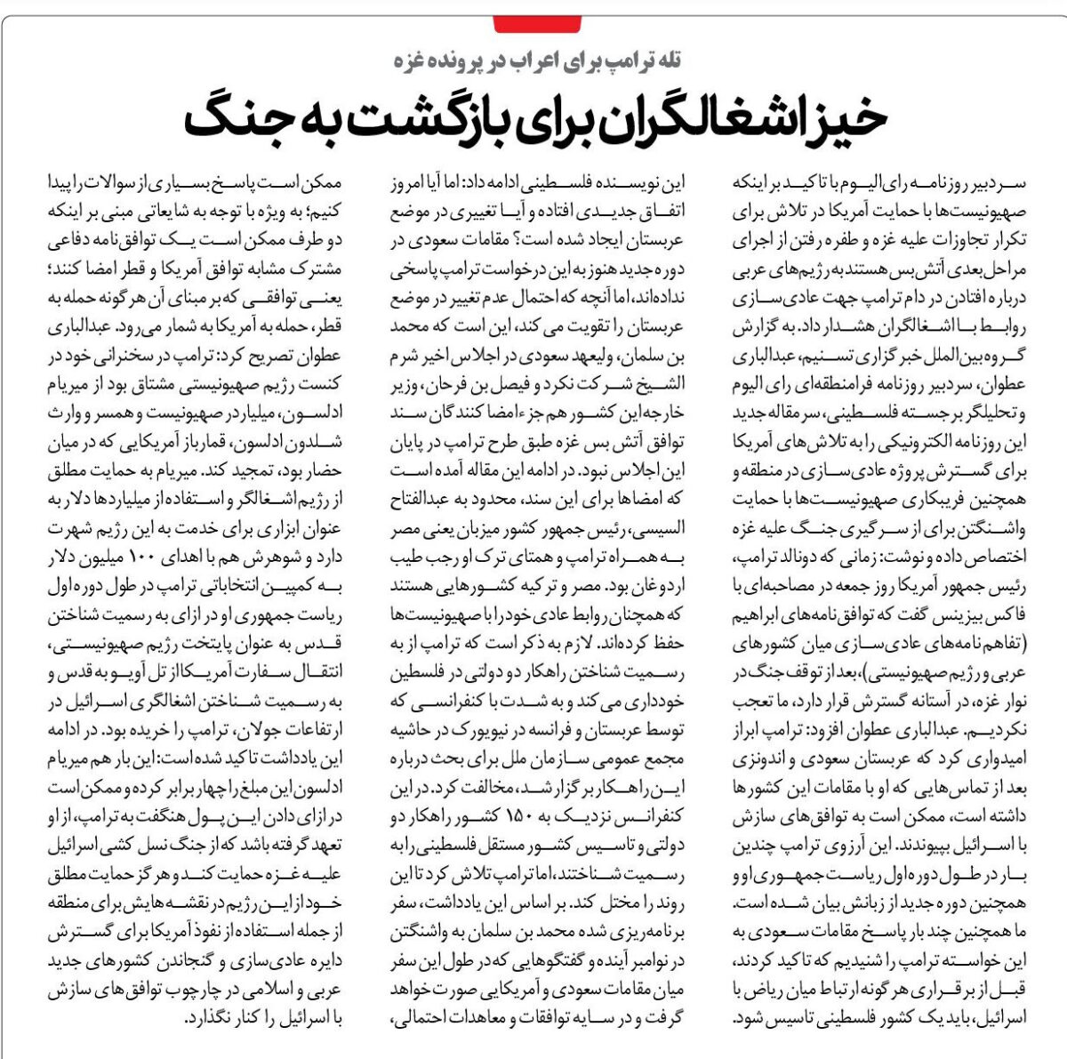 سردبیر روزنامه رایالیوم با تاکید بر اینکه صهیونیستها با حمایت آمریکا در تلاش برای تکرار تجاوزات علیه غزه و طفره رفتن از اجرای مراحل بعدی آتشبس هستند به رژیمهای عربی درباره افتادن در دام ترامپ جهت عادیسازی روابط با اشغالگران هشدار داد. به گزارش گروه بینالملل خبرگزاری تسنیم، عبدالباری عطوان، سردبیر روزنامه فرامنطقهای رای الیوم و تحلیلگر برجسته فلسطینی، سرمقاله جدید این روزنامه الکترونیکی را به تلاشهای آمریکا برای گسترش پروژه عادیسازی در منطقه و همچنین فریبکاری صهیونیستها با حمایت واشنگتن برای از سرگیری جنگ علیه غزه اختصاص داده و نوشت: زمانی که دونالد ترامپ، رئیس جمهور آمریکا روز جمعه در مصاحبهای با فاکس بیزینس گفت که توافقنامههای ابراهیم (تفاهم نامههای عادیسازی میان کشورهای عربی و رژیم صهیونیستی)، بعد از توقف جنگ در نوار غزه، در آستانه گسترش قرار دارد، ما تعجب نکردیم. عبدالباری عطوان افزود: ترامپ ابراز امیدواری کرد که عربستان سعودی و اندونزی بعد از تماسهایی که او با مقامات این کشورها داشته است، ممکن است به توافقهای سازش با اسرائیل بپیوندند. این آرزوی ترامپ چندین بار در طول دوره اول ریاست جمهوری او و همچنین دوره جدید از زبانش بیان شده است. ما همچنین چند بار پاسخ مقامات سعودی به این خواسته ترامپ را شنیدیم که تاکید کردند، قبل از برقراری هرگونه ارتباط میان ریاض با اسرائیل، باید یک کشور فلسطینی تاسیس شود. این نویسنده فلسطینی ادامه داد: اما آیا امروز اتفاق جدیدی افتاده و آیا تغییری در موضع عربستان ایجاد شده است؟ مقامات سعودی در دوره جدید هنوز به این درخواست ترامپ پاسخی ندادهاند، اما آنچه که احتمال عدم تغییر در موضع عربستان را تقویت میکند، این است که محمد بن سلمان، ولیعهد سعودی در اجلاس اخیر شرم الشیخ شرکت نکرد و فیصل بن فرحان، وزیر خارجه این کشور هم جزء امضا کنندگان سند توافق آتش بس غزه طبق طرح ترامپ در پایان این اجلاس نبود. در ادامه این مقاله آمده است که امضاها برای این سند، محدود به عبدالفتاح السیسی، رئیس جمهور کشور میزبان یعنی مصر به همراه ترامپ و همتای ترک او رجب طیب اردوغان بود. مصر و ترکیه کشورهایی هستند که همچنان روابط عادی خود را با صهیونیستها حفظ کردهاند. لازم به ذکر است که ترامپ از به رسمیت شناختن راهکار دو دولتی در فلسطین خودداری میکند و به شدت با کنفرانسی که توسط عربستان و فرانسه در نیویورک در حاشیه مجمع عمومی سازمان ملل برای بحث درباره این راهکار برگزار شد، مخالفت کرد. در این کنفرانس نزدیک به 150 کشور راهکار دو دولتی و تاسیس کشور مستقل فلسطینی را به رسمیت شناختند، اما ترامپ تلاش کرد تا این روند را مختل کند. بر اساس این یادداشت، سفر برنامهریزی شده محمد بن سلمان به واشنگتن در نوامبر آینده و گفتگوهایی که در طول این سفر میان مقامات سعودی و آمریکایی صورت خواهد گرفت و در سایه توافقات و معاهدات احتمالی، ممکن است پاسخ بسیاری از سوالات را پیدا کنیم؛ به ویژه با توجه به شایعاتی مبنی بر اینکه دو طرف ممکن است یک توافقنامه دفاعی مشترک مشابه توافق آمریکا و قطر امضا کنند؛ یعنی توافقی که بر مبنای آن هرگونه حمله به قطر، حمله به آمریکا به شمار میرود. عبدالباری عطوان تصریح کرد: ترامپ در سخنرانی خود در کنست رژیم صهیونیستی مشتاق بود از میریام ادلسون، میلیاردر صهیونیست و همسر و وارث شلدون ادلسون، قمارباز آمریکایی که در میان حضار بود، تمجید کند. میریام به حمایت مطلق از رژیم اشغالگر و استفاده از میلیاردها دلار به عنوان ابزاری برای خدمت به این رژیم شهرت دارد و شوهرش هم با اهدای 100 میلیون دلار به کمپین انتخاباتی ترامپ در طول دوره اول ریاست جمهوری او در ازای به رسمیت شناختن قدس به عنوان پایتخت رژیم صهیونیستی، انتقال سفارت آمریکا از تل آویو به قدس و به رسمیت شناختن اشغالگری اسرائیل در ارتفاعات جولان، ترامپ را خریده بود. در ادامه این یادداشت تاکید شده است: این بار هم میریام ادلسون این مبلغ