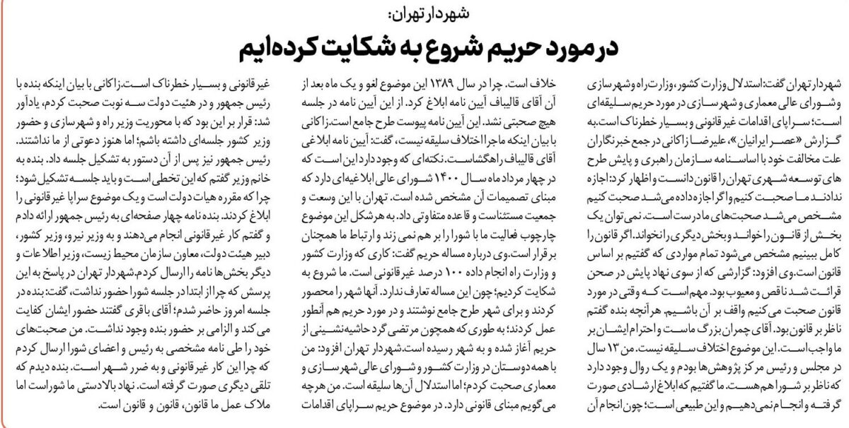 شهردار تهران گفت: استدلال وزارت کشور، وزارت راه و شهرسازی و شورای عالی معماری و شهرسازی در مورد حریم سلیقهای است؛ سراپای اقدامات غیرقانونی و بسیار خطرناک است.به گزارش «عصر ایرانیان»، علیرضا زاکانی در جمع خبرنگاران علت مخالفت خود با اساسنامه سازمان راهبری و پایش طرح های توسعه شهری تهران را قانون دانست و اظهار کرد: اجازه ندادند ما صحبت کنیم و اگر اجازه داده میشد صحبت کنیم مشخص میشد صحبتهای ما درست است. نمیتوان یک بخش از قانون را خواند و بخش دیگری را نخواند. اگر قانون را کامل ببینیم مشخص میشود تمام مواردی که گفتیم بر اساس قانون است.وی افزود: گزارشی که از سوی نهاد پایش در صحن قرائت شد ناقص و معیوب بود. مهم است که وقتی در مورد قانون صحبت میکنیم واقف بر آن باشیم. هرآنچه بنده گفتم ناظر بر قانون بود. آقای چمران بزرگ ماست و احترام ایشان بر ما واجب است. این موضوع اختلاف سلیقه نیست. من ۱۳ سال در مجلس و رئیس مرکز پژوهشها بودم و یک روال وجود دارد که ناظر بر شورا هم هست. ما گفتیم که ابلاغ ارشادی صورت گرفته و انجام نمیدهیم و این طبیعی است؛ چون انجام آن خلاف است. چرا در سال ۱۳۸۹ این موضوع لغو و یک ماه بعد از آن آقای قالیباف آیین نامه ابلاغ کرد. از این آیین نامه در جلسه هیچ صحبتی نشد. این آیین نامه پیوست طرح جامع است.زاکانی با بیان اینکه ماجرا اختلاف سلیقه نیست، گفت: آیین نامه ابلاغی آقای قالیباف راهگشاست. نکتهای که وجود دارد این است که در چهار مرداد ماه سال ۱۴۰۰ شورای عالی ابلاغیهای دارد که مبنای تصمیمات آن مشخص شده است. تهران با این وسعت و جمعیت مستثناست و قاعده متفاوتی داد. به هرشکل این موضوع چارچوب فعالیت ما با شورا را بر هم نمی زند و ارتباط ما همچنان برقرار است.وی درباره مساله حریم گفت: کاری که وزارت کشور و وزارت راه انجام داده ۱۰۰ درصد غیرقانونی است. ما شروع به شکایت کردیم؛ چون این مساله تعارف ندارد. آنها شهر را محصور کردند و برای شهر طرح جامع نوشتند و در مورد حریم هم آنطور عمل کردند؛ به طوریکه همچون مرتضیگرد حاشیهنشینی از حریم آغاز شده و به شهر رسیده است.شهردار تهران افزود: من با همه دوستان در وزارت کشور و شورای عالی شهرسازی و معماری صحبت کردم؛ اما استدلال آنها سلیقه است. من هرچه میگویم مبنای قانونی دارد. در موضوع حریم سراپای اقدامات غیرقانونی و بسیار خطرناک است.زاکانی با بیان اینکه بنده با رئیس جمهور و در هئیت دولت سه نوبت صحبت کردم، یادآور شد: قرار بر این بود که با محوریت وزیر راه و شهرسازی و حضور وزیر کشور جلسهای داشته باشم؛ اما هنوز دعوتی از ما نداشتند. رئیس جمهور نیز پس از آن دستور به تشکیل جلسه داد. بنده به خانم وزیر گفتم که این تخطی است و باید جلسه تشکیل شود؛ چرا که مقرره هیات دولت است و یک موضوع سراپا غیرقانونی را ابلاغ کردند. بنده نامه چهار صفحهای به رئیس جمهور ارائه دادم و گفتم کار غیرقانونی انجام میدهند و به وزیر نیرو، وزیر کشور، دبیر هیئت دولت، معاون سازمان محیط زیست، وزیر اطلاعات و دیگر بخشها نامه را ارسال کردم.شهردار تهران در پاسخ به این پرسش که چرا از ابتدا در جلسه شورا حضور نداشت، گفت: بنده در جلسه امروز حاضر شدم؛ آقای باقری گفتند حضور ایشان کفایت میکند و الزامی بر حضور بنده وجود نداشت. من صحبتهای خود را طی نامه مشخصی به رئیس و اعضای شورا ارسال کردم که چرا این کار غیرقانونی و به ضرر شهر است. بنده دیدم که تلقی دیگری صورت گرفته است. نهاد بالادستی ما شوراست اما ملاک عمل ما قانون، قانون و قانون است.