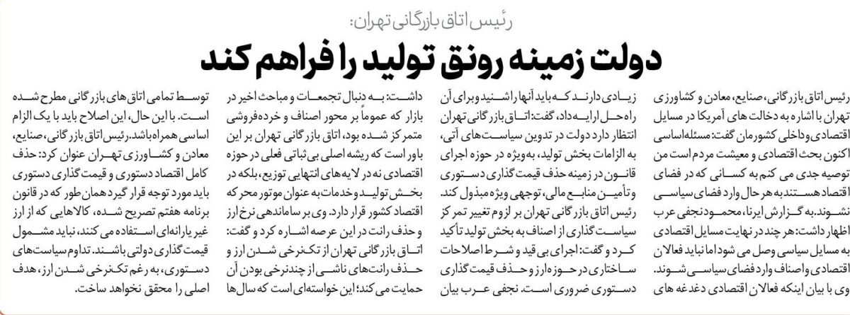 رئیس اتاق بازرگانی، صنایع، معادن و کشاورزی تهران با اشاره به دخالت های آمریکا در مسایل اقتصادی و داخلی کشورمان گفت: مسئله اساسی اکنون بحث اقتصادی و معیشت مردم است من توصیه جدی می کنم به کسانی که در فضای اقتصاد هستند به هر حال وارد فضای سیاسی نشوند.به گزارش ایرنا، محمود نجفی عرب اظهار داشت: هر چند در نهایت مسایل اقتصادی به مسایل سیاسی وصل می شود اما نباید فعالان اقتصادی و اصناف وارد فضای سیاسی شوند.وی با بیان اینکه فعالان اقتصادی دغدغه های زیادی دارند که باید آنها را شنید و برای آن راه حل ارایه داد، گفت: اتاق بازرگانی تهران انتظار دارد دولت در تدوین سیاستهای آتی، به الزامات بخش تولید، بهویژه در حوزه اجرای قانون در زمینه حذف قیمتگذاری دستوری و تأمین منابع مالی، توجهی ویژه مبذول کند.رئیس اتاق بازرگانی تهران بر لزوم تغییر تمرکز سیاستگذاری از اصناف به بخش تولید تأکید کرد و گفت: اجرای بیقید و شرط اصلاحات ساختاری در حوزه ارز و حذف قیمتگذاری دستوری ضروری است. نجفی عرب بیان داشت: به دنبال تجمعات و مباحث اخیر در بازار که عموماً بر محور اصناف و خردهفروشی متمرکز شده بود، اتاق بازرگانی تهران بر این باور است که ریشه اصلی بیثباتی فعلی در حوزه اقتصادی نه در لایههای انتهایی توزیع، بلکه در بخش تولید و خدمات به عنوان موتور محرکه اقتصاد کشور قرار دارد. وی بر ساماندهی نرخ ارز و حذف رانت در این عرصه اشاره کرد و گفت: اتاق بازرگانی تهران از تکنرخی شدن ارز و حذف رانتهای ناشی از چندنرخی بودن آن حمایت میکند؛ این خواستهای است که سالها توسط تمامی اتاقهای بازرگانی مطرح شده است. با این حال، این اصلاح باید با یک الزام اساسی همراه باشد.رئیس اتاق بازرگانی، صنایع، معادن و کشاورزی تهران عنوان کرد: حذف کامل اقتصاد دستوری و قیمتگذاری دستوری باید مورد توجه قرار گیرد همانطور که در قانون برنامه هفتم تصریح شده، کالاهایی که از ارز غیر یارانهای استفاده میکنند، نباید مشمول قیمتگذاری دولتی باشند. تداوم سیاستهای دستوری، به رغم تکنرخی شدن ارز، هدف اصلی را محقق نخواهد ساخت.