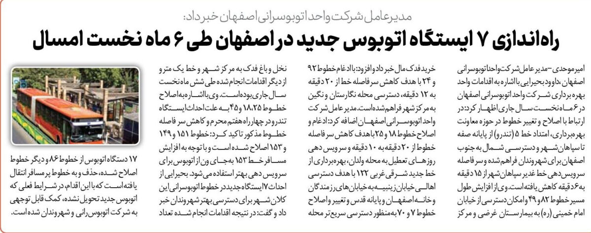 امیر موحدی-مدیرعامل شرکت واحد اتوبوسرانی اصفهان ،داوود بحیرایی با اشاره به اقدامات واحد بهره برداری شرکت واحد اتوبوسرانی اصفهان در ۶ ماه نخست سال جاری اظهار کرد: در ارتباط با اصلاح و تغییر خطوط در حوزه معاونت بهرهبرداری، امتداد خط ۵ (تندرو) از پایانه صفه تا سپاهانشهر و دسترسی شمال به جنوب اصفهان برای شهروندان فراهم شده و سرفاصله سرویسدهی خط غدیر سپاهانشهر از ۱۵ دقیقه به ۶ دقیقه کاهش یافته است. وی از افزایش طول مسیر خطوط ۸۲ و ۴۹ و امکان دسترسی از خیابان امام خمینی (ره) به بیمارستان غرضی و مرکز خرید فدک مال خبر داد و افزود: با ادغام خطوط ۹۲ و ۲۴ با هدف کاهش سرفاصله خط از ۲۰ دقیقه به ۱۲ دقیقه، دسترسی محله نگارستان و نگین به مرکز شهر فراهم شده است. مدیرعامل شرکت واحد اتوبوسرانی اصفهان اضافه کرد: ادغام و اصلاح خطوط ۱۸ و ۲۵ با هدف کاهش سرفاصله خطوط از ۲۰ دقیقه به ۱۰ دقیقه و سرویس دهی روزهای تعطیل به محله ولدان، بهرهبرداری از خط جدید شرقیغربی ۱۲۲ با هدف دسترسی اهالی خیابان زینبیه به خیابانهای رزمندگان و خانه اصفهان و پایانه قدس و تغییر و اصلاح خطوط ۷ و ۷۰ بهمنظور دسترسی سریعتر محله نخل و باغ فدک به مرکز شهر و خط یک مترو از دیگر اقدامات انجام شده طی شش ماه نخست سال جاری بوده است. وی با اشاره به اصلاح خطوط ۲۵، ۱۸ و ۴۵ به علت احداث ایستگاه تندرو در چهارراه هفتم محرم و کاهش سر فاصله خطوط مذکور تاکید کرد: خطوط ۱۵۱ و ۱۴۹ و ۱۵۳ اصلاح شده است و با توجه به افزایش مسافر خط ۱۵۳ بهجای ون از اتوبوس برای سرویس دهی بهتر استفاده میشود. بحیرایی از احداث ۷ ایستگاه جدید در خطوط اتوبوسرانی این کلانشهر برای دسترسی بهتر شهروندان خبر داد و گفت: در نتیجه اقدامات انجام شده تعداد ۱۷ دستگاه اتوبوس از خطوط ۸۶ و دیگر خطوط اصلاح شده، حذف و به خطوط پرمسافر انتقال یافته است که با این اقدام، در شرایط فعلی که اتوبوس جدید تحویل نشده، کمک قابل توجهی به شرکت اتوبوسرانی و شهروندان شده است.
