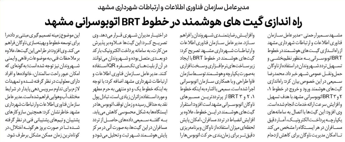 راه اندازی گیت های هوشمند در خطوط BRT اتوبوسرانی مشهد