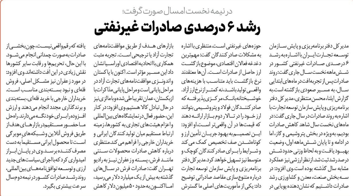مدیرکل دفتر برنامهریزی و پایش سازمان توسعه تجارت ایران با اشاره به رشد ۶ درصدی صادرات غیرنفتی کشور در ششماهه نخست سال جاری گفت: روند صادرات پس از تجربه افت در ماههای ابتدایی سال، به مسیر صعودی بازگشته است.به گزارش ایلنا، محسن منتظری، مدیرکل دفتر برنامهریزی و پایش سازمان توسعه تجارت با اشاره به روند صادرات در سال جاری گفت: در ماههای نخست سال شاهد کاهش صادرات بودیم، بهویژه در بخش پتروشیمی و گاز، اما در ادامه و تا پایان ششماهه اول، وضعیت بهبود یافت و به لحاظ وزنی حدود شش درصد رشد ثبت شد. از نظر ارزشی نیز عملکرد مشابه سال گذشته بوده است.وی افزود: در سه بخش صنعت، معدن و کشاورزی رشد صادرات داشتیم که نشاندهنده پویایی در حوزههای غیرنفتی است.منتظری با اشاره به مشکلات صادرکنندگان گفت: مهمترین دغدغه فعالان اقتصادی، موضوع بازگشت ارز حاصل از صادرات است. آنها معتقدند نرخ بازگشت باید متناسب با هزینههای واقعی تولید باشد، نه کمتر از نرخ ارز آزاد. خوشبختانه بانک مرکزی پذیرفته که صادرکنندگان فولاد و پتروشیمی بتوانند ارز خود را در تالار دوم بازار ارائه دهند که قیمتها در آن واقعیتر است.او افزود: این تصمیم به بهبود جریان تأمین ارز و کوتاهشدن صف تخصیص کمک میکند و شرایط را برای صادرکنندگان کوچک و متوسط نیز تسهیل خواهد کرد.مدیرکل دفتر برنامهریزی و پایش سازمان توسعه تجارت درباره متنوعسازی مقاصد صادراتی توضیح داد: یکی از مأموریتهای اصلی ما گسترش بازارهای هدف از طریق موافقتنامههای تجارت آزاد یا ترجیحی است. تجربه مثبت همکاری با اتحادیه اقتصادی اوراسیا نشان داد این مسیر مؤثر است. اکنون با پاکستان و اندونزی موافقتنامههای تجارت آزاد در مراحل پایانی است و مراحل پایانی مذاکرات با ازبکستان، عمان تقریبا طی شده و با مالزی نیز در حال تبادل کالا هستیم.وی افزود: در کنار این، حضور فعال در نمایشگاههای بینالمللی و اعزام هیئتهای تجاری به کشورها، زمینه ارتباط مستقیم میان تولیدکنندگان ایرانی و خریداران خارجی را فراهم میکند.منتظری درباره کاهش صادرات محصولات سنتی مانند فرش، پسته و زعفران نیز به رادیو تهران گفت: صادرات فرش در سالهای گذشته به بیش از یک میلیارد دلار میرسید، اما اکنون به حدود 50 میلیون دلار کاهش یافته که رقم واقعی نیست، چون بخشی از صادرات بهصورت چمدانی انجام میشود. با این حال، تحریمها و رقابت سایر کشورها نقش زیادی در این اُفت داشتهاند.وی افزود: در مورد زعفران نیز مشکل اصلی، فروش فلهای و نبود بستهبندی مناسب است. خریداران خارجی با خرید فلهای، بستهبندی و برندگذاری مجدد انجام میدهند و ارزش افزوده را برای خود نگه میدارند. راهحل ما حضور مستقیم در بازارهای هدف از طریق فروش آنلاین و شبکههای مویرگی است تا محصول ایرانی مستقیماً به دست مصرفکننده برسد.وی در پایان ابراز امیدواری کرد که با اجرای سیاستهای جدید ارزی و توسعه توافقنامههای بینالمللی، روند رشد صادرات کشور در نیمه دوم سال سرعت بیشتری بگیرد.