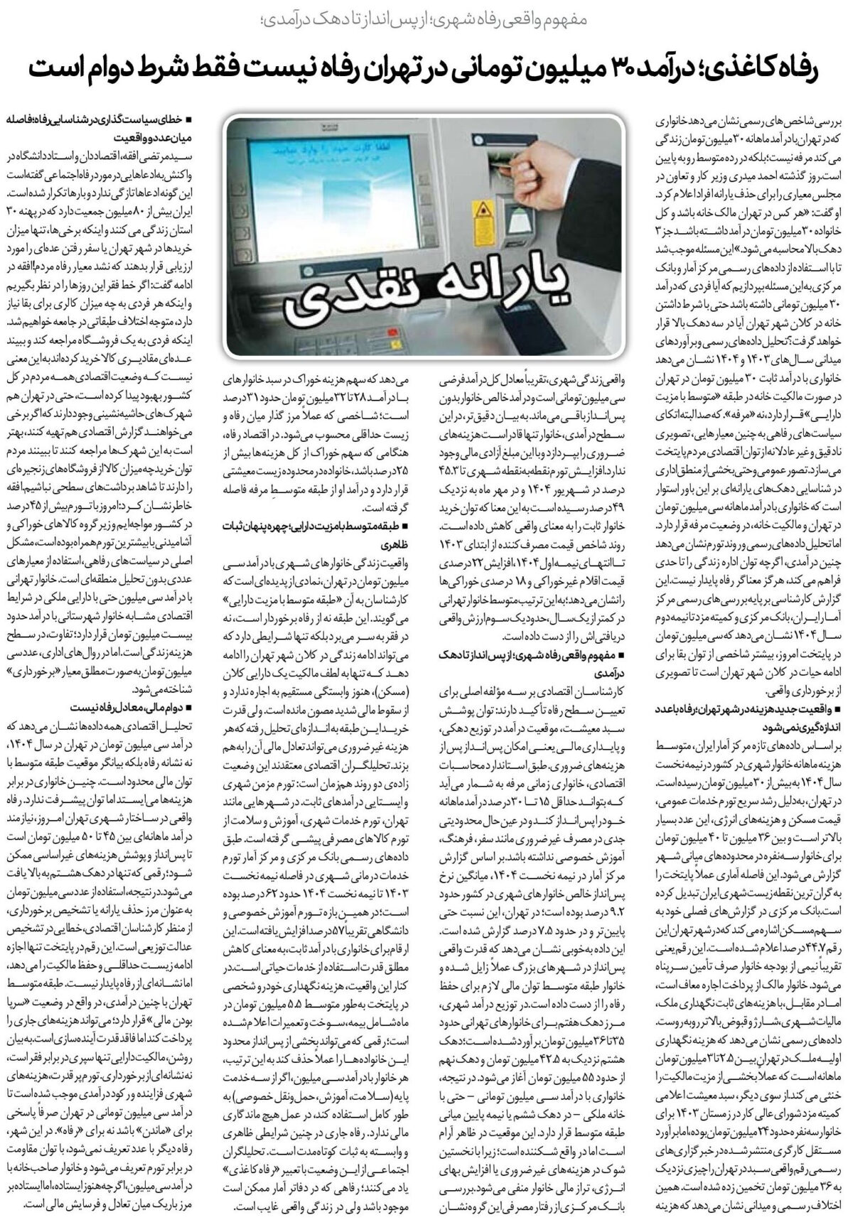 بررسی شاخصهای رسمی نشان میدهد خانواری که در تهران با درآمد ماهانه ۳۰ میلیون تومان زندگی میکند مرفه نیست؛ بلکه در رده متوسط رو به پایین است.روز گذشته احمد میدری وزیر کار و تعاون در مجلس معیاری را برای حذف یارانه افراد اعلام کرد. او گفت: «هر کس در تهران مالک خانه باشد و کل خانواده ۳۰ میلیون تومان درآمد داشته باشد جز ۳ دهک بالا محاسبه میشود.» این مسئله موجب شد تا با استفاده از دادههای رسمی مرکز آمار و بانک مرکزی به این مسئله بپردازیم که آیا فردی که درآمد ۳۰ میلیون تومانی داشته باشد حتی با شرط داشتن خانه در کلان شهر تهران آیا در سه دهک بالا قرار خواهد گرفت؟تحلیل دادههای رسمی و برآوردهای میدانی سالهای ۱۴۰۳ و ۱۴۰۴ نشان میدهد خانواری با درآمد ثابت ۳۰ میلیون تومان در تهران در صورت مالکیت خانه در طبقه «متوسط با مزیت دارایی» قرار دارد، نه «مرفه». که صد البته اتکای سیاستهای رفاهی به چنین معیارهایی، تصویری نادقیق و غیرعادلانه از توان اقتصادی مردم پایتخت میسازد.تصور عمومی و حتی بخشی از منطق اداری در شناسایی دهکهای یارانهای بر این باور استوار است که خانواری با درآمد ماهانه سی میلیون تومان در تهران و مالکیت خانه، در وضعیت مرفه قرار دارد. اما تحلیل دادههای رسمی و روند تورم نشان میدهد چنین درآمدی، اگرچه توان اداره زندگی را تا حدی فراهم میکند، هرگز معناگر رفاه پایدار نیست.این گزارش کارشناسی بر پایه بررسیهای رسمی مرکز آمار ایران، بانک مرکزی و کمیته مزد تا نیمه دوم سال ۱۴۰۴ نشان میدهد که سی میلیون تومان در پایتخت امروز، بیشتر شاخصی از توان بقا برای ادامه حیات در کلان شهر تهران است تا تصویری از برخورداری واقعی.