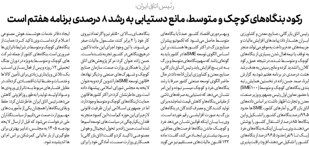 رئیس اتاق بازرگانی، صنایع، معدن و کشاورزی ایران هشدار داد: پیامدهای افزایش مالیات و جریمههای عدم پرداخت بهموقع میتواند منجر به توقف یا نیمهفعال شدن بسیاری از بنگاههای کوچک و متوسط شده، در نتیجه عمق رکود کلان را تشدید کرده و مانع رسیدن به هدف رشد هشت درصدی در برنامه هفتم شود.به گزارش ایرنا، صمد حسن زاده در نخستین همایش رتبه بندی بنگاههای کوچک و متوسط (SME۱۰۰) با حضور معاون اول رئیس جمهور و وزیر صنعت، معدن و تجارت اظهار داشت: بر اساس دادههای اتاق بازرگانی و آمارهای کشور، SME ها حدود ۹۹.۵ درصد بنگاههای کشور را تشکیل و این بنگاهها ۸۵ درصد از اشتغال کشور را پوشش میدهند.وی با بیان اینکه بنگاههای خرد (یک تا ۹ نفر) حدود ۹۶.۵ درصد از بنگاههای کشور را تشکیل میدهند، افزود: رقابتپذیری و بهرهوری اقتصاد کشور عمدتاً با بنگاههای متوسط حاصل میشود که لکموتیو پیشران صنایع بزرگ در اکثر کشورها هستند، بر این اساس الگوی توسعه SMEها در کشور باید به گونهای باشد که سهم بنگاههای متوسط و بزرگ به تدریج افزایش یابد.رئیس اتاق بازرگانی، صنایع، معدن و کشاورزی ایران ادامه داد: در حال حاضر الگوی توسعه صنعتی کشور صرفا با رشد بنگاههای خرد و کوچک میسر نبوده و این امر نشان میدهد که دستیابی به صرفههای ناشی از مقیاس بنگاهها و کاهش قیمت تمامشده برای تولیدکنندگان و مصرفکنندگان در بنگاههای بزرگ به صورت افزایشی رقم خورده است.وی با بیان اینکه قوانین نشان میدهد خرد و کوچک ماندن بنگاهها فرصتهای معافیتی و سود بیشتری ایجاد میکند، گفت: ماده ۱۳۲ قانون مالیاتهای مستقیم نیز میگوید بنگاههای بالای ۵۰ نفر نیرو اگر تعداد نیروی کار خود را ۲ برابر کنند، مشمول مالیات صفر میشوند. با این وجود اجرای این ماده تاکنون در هیچ بنگاهی در کشور تجربه نشده است.حسن زاده عنوان کرد: مرکز پژوهشهای اتاق ایران با همکاری وزارت صمت، سازمان صنایع کوچک و شهرکهای صنعتی و دیگر نهادها، «قانون توسعه SMEها را تدوین کرده و بهعنوان لایحه به مجلس شورای اسلامی پیشنهاد داده است.وی خاطرنشان کرد: در اکثر کشورها قانون حمایت از بنگاههای کوچک و متوسط وجود دارد، اما در جمهوری اسلامی ایران ظرفیت قانونی لازم برای این حوزه کم است؛ این کمبود منجر به فقدان یکپارچگی در سیاستهای توسعه اسمها شده است.حسن زاده بر تحول دیجیتال و هوش مصنوعی تاکید کرد و گفت: اتاق بازرگانی با همکاری وزارت صمت، آمادگی خود را برای ایجاد دفاتر خدمات هوشمند هوش مصنوعی اعلام کرده است.وی تاکید کرد: حمایت از بنگاههای کوچک و متوسط در شرایط ناترازیها ضروری است. بنگاههای کشور از جمله شرکت های کوچک و متوسط بهویژه در دوران جنگ تحمیلی 12 روزه و پس از فعالسازی اسنپ بک، تلاش و پایداری زیادی برای تأمین کالاها و خدمات و حفظ ثبات اقتصادی کردهاند. در مقابل فشارهای مربوط به ناترازی ورودیها و مواد اولیه، تولید را بهطور روزافزونی کاهش میدهد.رئیس اتاق ایران خاطرنشانکرد: حفظ و بقای بنگاهها را همچنان یکی از مأموریتهای مهم وزارت صمت میدانیم. از سیاستگذاران ملی درخواست میشود که قبل از ارسال لایحه بودجه ۱۴۰۵ به مجلس، تدابیر بهتری برای جلوگیری از بار مالیاتی کمرشکن بر اس ام ای ها اندیشیده شود.