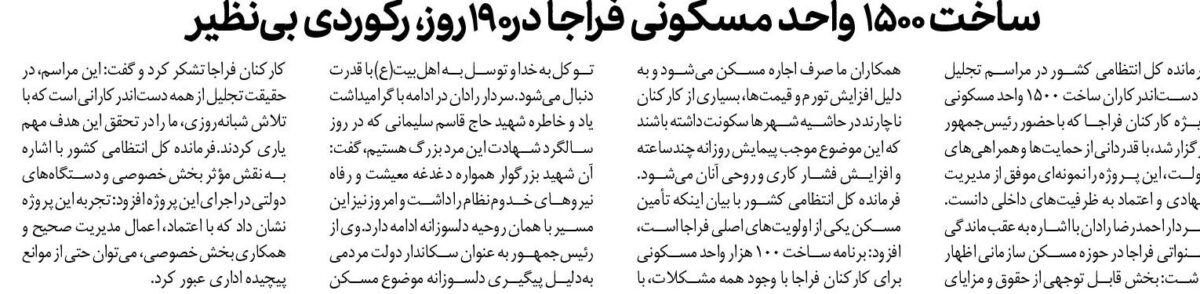 فرمانده کل انتظامی کشور در مراسم تجلیل از دستاندرکاران ساخت ۱۵۰۰ واحد مسکونی ویژه کارکنان فراجا که با حضور رئیسجمهور برگزار شد، با قدردانی از حمایتها و همراهیهای دولت، این پروژه را نمونهای موفق از مدیریت جهادی و اعتماد به ظرفیتهای داخلی دانست. سردار احمدرضا رادان با اشاره به عقبماندگی سنواتی فراجا در حوزه مسکن سازمانی اظهار داشت: بخش قابل توجهی از حقوق و مزایای همکاران ما صرف اجاره مسکن میشود و به دلیل افزایش تورم و قیمتها، بسیاری از کارکنان ناچارند در حاشیه شهرها سکونت داشته باشند که این موضوع موجب پیمایش روزانه چندساعته و افزایش فشار کاری و روحی آنان میشود.فرمانده کل انتظامی کشور با بیان اینکه تأمین مسکن یکی از اولویتهای اصلی فراجا است، افزود: برنامه ساخت ۱۰۰ هزار واحد مسکونی برای کارکنان فراجا با وجود همه مشکلات، با توکل به خدا و توسل به اهلبیت(ع) با قدرت دنبال میشود.سردار رادان در ادامه با گرامیداشت یاد و خاطره شهید حاج قاسم سلیمانی که در روز سالگرد شهادت این مرد بزرگ هستیم، گفت: آن شهید بزرگوار همواره دغدغه معیشت و رفاه نیروهای خدوم نظام را داشت و امروز نیز این مسیر با همان روحیه دلسوزانه ادامه دارد.وی از رئیسجمهور به عنوان سکاندار دولت مردمی بهدلیل پیگیری دلسوزانه موضوع مسکن کارکنان فراجا تشکر کرد و گفت: این مراسم، در حقیقت تجلیل از همه دستاندرکارانی است که با تلاش شبانهروزی، ما را در تحقق این هدف مهم یاری کردند.فرمانده کل انتظامی کشور با اشاره به نقش مؤثر بخش خصوصی و دستگاههای دولتی در اجرای این پروژه افزود: تجربه این پروژه نشان داد که با اعتماد، اعمال مدیریت صحیح و همکاری بخش خصوصی، میتوان حتی از موانع پیچیده اداری عبور کرد.