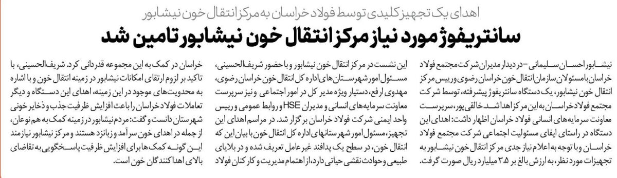 نیشابور احسان سلیمانی – در دیدار مدیران شرکت مجتمع فولاد خراسان با مسئولان سازمان انتقال خون خراسان رضوی و رییس مرکز انتقال خون نیشابور، یک دستگاه سانتریفوژ پیشرفته، توسط شرکت مجتمع فولاد خراسان به این مرکز اهدا شد. خالقیپور، سرپرست معاونت سرمایههای انسانی فولاد خراسان اظهار داشت: اهدای این دستگاه در راستای ایفای مسئولیت اجتماعی شرکت مجتمع فولاد خراسان و با توجه به اعلام نیاز جدی مرکز انتقال خون نیشابور به تجهیزات مورد نظر، به ارزش بالغ بر ۳.۵ میلیارد ریال صورت گرفت. این نشست در مرکز انتقال خون نیشابور و با حضور شریفالحسینی، مسئول امور شهرستانهای اداره کل انتقال خون خراسان رضوی، مهدوی ارفع، دستیار ویژه مدیر کل در امور اجتماعی و نیز سرپرست معاونت سرمایههای انسانی و مدیران HSE و روابط عمومی و رییس واحد ایمنی شرکت فولاد خراسان برگزار شد. در مراسم اهدای این تجهیز، مسئول امور شهرستانهای اداره کل انتقال خون با بیان این که انتقال خون، در سطح یک پدافند غیرعامل تعریف شده و در بلایای طبیعی و حوادث نقشی حیاتی دارد، از اهتمام مدیریت و کارکنان فولاد خراسان در کمک به این مجموعه قدردانی کرد. شریفالحسینی، با تاکید بر لزوم ارتقای امکانات نیشابور در زمینه انتقال خون و با اشاره به محدویتهای موجود در این زمینه، اهدای این دستگاه و دیگر تعاملات فولاد خراسان را باعث افزایش ظرفیت جذب و ذخایر خونی شهرستان دانست و گفت: مردم نیشابور در زمینه کمک به هم نوعان، از جمله در اهدای خون سرآمد و زبانزد هستند و مرکز نیشابور نیازمند این گونه کمک ها برای افزایش ظرفیت پاسخگویی به تقاضای بالای اهداکنندگان خون است.