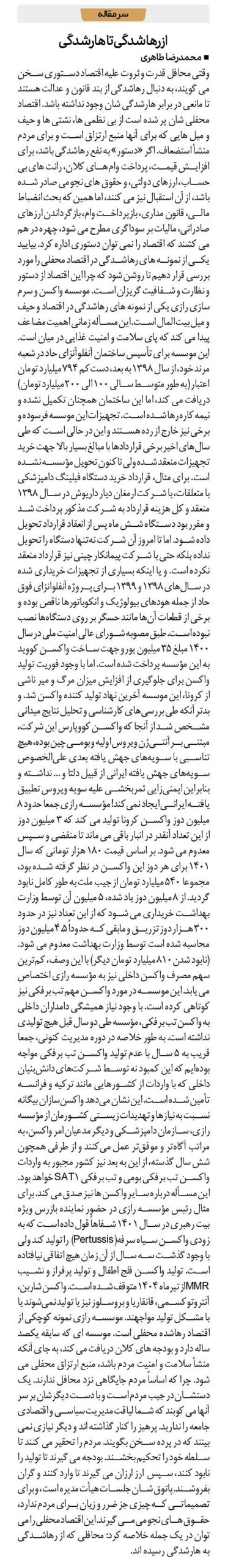 وقتی محافل قدرت و ثروت علیه اقتصاد دستوری سخن می گویند، به دنبال رهاشدگی از بند قانون و عدالت هستند تا مانعی در برابر هارشدگی شان وجود نداشته باشد. اقتصاد محفلی شان پر شده است از بی نظمی ها، نشتی ها و حیف و میل هایی که برای آنها منبع ارتزاق است و برای مردم منشأ استضعاف. اگر «دستور» به نفع رهاشدگی باشد، برای افزایش قیمت، پرداخت وام های کلان، رانت های بی حساب، ارزهای دولتی، و حقوق های نجومی صادر شده باشد، از آن استقبال نیز می کنند، اما همین که بحث انضباط مالی، قانون مداری، بازپرداخت وام، بازگرداندن ارزهای صادراتی، مالیات بر سوداگری مطرح می شود، چهره در هم می کشند که اقتصاد را نمی توان دستوری اداره کرد. بیایید یکی از نمونه های رهاشدگی در اقتصاد محفلی را مورد بررسی قرار دهیم تا روشن شود که چرا این اقتصاد از دستور و نظارت و شفافیت گریزان است. موسسه واکسن و سرم سازی رازی یکی از نمونه های رهاشدگی در اقتصاد و حیف و میل بیت المال است. این مسأله زمانی اهمیت مضاعف پیدا می کند که پای سلامت و امنیت غذایی در میان است. این موسسه برای تأسیس ساختمان آنفلوآنزای حاد در شعبه مرند خود، از سال 1398 به بعد، دستکم ۷۹۴ میلیارد تومان اعتبار (به طور متوسط سالی ۱۰۰ الی ۲۰۰ میلیارد تومان) دریافت می کند، اما این ساختمان همچنان تکمیل نشده و نیمه کاره رها شده است. تجهیزات این موسسه فرسوده و برخی نیز خارج از رده هستند و این در حالی است که طی سالهای اخیر برخی قراردادها با مبالغ بسیار بالا جهت خرید تجهیزات منعقد شده ولی تاکنون تحویل مؤسسه نشده است. برای مثال، قرارداد خرید دستگاه فیلینگ دامپزشکی با متعلقات، با شرکت ارمغان دیار داریوش در سال ۱۳۹۸ منعقد و کل هزینه قرارداد به شرکت مذکور پرداخت شد و مقرر بود دستگاه شش ماه پس از انعقاد قرارداد تحویل داده شود. اما تا امروز آن شرکت نهتنها دستگاه را تحویل نداده بلکه حتی با شرکت پیمانکار چینی نیز قرارداد منعقد نکرده است. و یا اینکه بسیاری از تجهیزات خریداری شده در سالهای ۱۳۹۸ و ۱۳۹۹ برای پروژه آنفلوانزای فوق حاد از جمله هودهای بیولوژیک و انکوباتورها ناقص بوده و برخی از قطعات آنها مانند حسگر بر روی دستگاهها نصب نبوده است. طبق مصوبه شورای عالی امنیت ملی در سال ۱۴۰۰ مبلغ ۳۵ میلیون یورو جهت ساخت واکسن کووید به این مؤسسه پرداخت شده است. اما با وجود فوریت تولید واکسن برای جلوگیری از افزایش میزان مرگ و میر ناشی از کرونا، این موسسه آخرین نهاد تولید کننده واکسن شد. و بدتر آنکه طی بررسیهای کارشناسی و تحلیل نتایج میدانی مشخص شد از آنجا که واکسن کووپارس این شرکت، مبتنی بر آنتیژن ویروس اولیه و بومی چین بوده، هیچ تناسبی با سویههای جهش یافته بعدی علیالخصوص سویههای جهش یافته ایرانی از قبیل دلتا و … نداشته و بنابراین ایمنیزایی ثمربخشی علیه سویه ویروس تطبیق یافته ایرانی ایجاد نمیکند! مؤسسه رازی جمعا حدود ۸ میلیون دوز واکسن کرونا تولید می کند که ۳ میلیون دوز از این تعداد آنقدر در انبار باقی می ماند تا منقضی و سپس معدوم می شود. بر اساس قیمت 180 هزار تومانی که سال 1401 برای هر دوز این واکسن در نظر گرفته شده بود، مجموعا 540 میلیارد تومان از جیب ملت به طور کامل نابود گردید. از ۸ میلیون دوز یاد شده، ۵ میلیون آن توسط وزارت بهداشت خریداری می شود که از این تعداد نیز در حدود ۳۰۰ هزار دوز تزریق و مابقی که حدوداً ۴.۵ میلیون دوز محاسبه شده است توسط وزارت بهداشت معدوم می شود. (نابود شدن810 میلیارد تومان دیگر) با این وصف، کمترین سهم مصرف واکسن داخلی نیز به مؤسسه رازی اختصاص می یابد. این موسسه در مورد واکسن مهم تب برفکی نیز کوتاهی کرده است. با وجود نیاز همیشگی دامداران داخلی به واکسن تب برفکی، مؤسسه طی دو سال قبل هیچ تولیدی نداشته است. به طور خلاصه در دوره مدیریت کنونی، جمعا قریب به ۵ سال با عدم تولید واکسن تب برفکی مواجه بودهایم که این کمبود نه توسط شرکتهای دانشبنیان داخلی که با واردات از کشورهایی مانند ترکیه و فرانسه ت