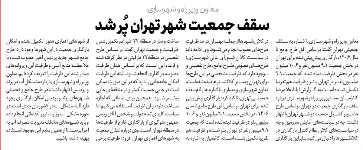 معاون وزیر راه و شهرسازی با اشاره به سقف جمعیتی تهران گفت: براساس افق طرح جامع تا سال ١۴٠۶، بارگذاری پیش‌بینی شده برای تهران در بخش جمعیت ٩.١ میلیون نفر و ١٠.۶ میلیون نفر در بخش ظرفیت دیده شده، که جمعیت ٩.١ میلیون نفر در تهران پـُر و ظرفیت هم تقریبا تکمیل شده است.به گزارش ایلنا،غلامرضا کاظمیان، معاون وزیر راه و شهرسازی درباره سقف بارگذاری جمعیت در تهران براساس طرح جامع و کنترل جمعیت در شهر تهران، اظهار داشت: چه در سیاست‌های آمایش سرزمین و چه در سیاست‌های کلان نظام کنترل بارگذاری در کلانشهرها را دنبال می‌کنیم بنابراین بارگذاری در کلان شهرها از جمله تهران در حد ظرفیت طرح‌های مصوب انجام می‌شود. وی ادامه داد: در سیاست کلان شورای عالی شهرسازی؛ طرح‌های مصوبی طرح جامع، طرح تفصیلی و …وجود دارد که ظرفیت مشخصی در این طرح‌ها برای تهران و سایر کلانشترها دیده شده است.معاون شهرسازی و معماری با اشاره به ارقام سقف جمعیتی تهران، تاکید کرد: بارگذاری پیش بینی شده برای تهران براساس افق طرح جامع تا سال ١۴٠۶ ، در بخش جمعیت ٩.١ میلیون نفر و ١٠.۶ میلیون نفر در ظرفیت دیده شده است که جمعیت ٩.١ میلیون نفر در تهران پـُر شده و ظرفیت هم تقریبا تکمیل شده است. کاظمیان به اشاره به ساخت و ساز در منطقه ٢٢ علیرغم تکمیل شدن ظرفیت و جمعیت تهران گفت: براساس طرح تفصیلی در منطقه٢٢ ظرفیتی در نظر گرفته شده و قاعده این است که براساس همان ظرفیت مصوب، بارگذاری انجام شود. البته این ظرفیت امکان جابه‌جایی را دارد که در این صورت ممکن است در جایی جمعیت کمتر و در منطقه‌ای جایی بیشتر شود. همچنین برای مناطقی که اجازه ساخت دارد، از آن ظرفیت استفاده می‌کنیم اما سیاست کلیدی تمام دولت و شخص آقای رییس جمهور جلوگیری از بارگذاری خارج از ظرفیت‌ها در منطقه تهران است.وی درباره انتقال جمعیت به شهرهای اقماری تهران افزود: ظرفیت برخی از شهرهای اقماری هنوز تکمیل نشده و امکان بارگذاری جمعیت در این شهرها وجود دارد. طرح جامع شهر جدید پردیس اخیرا مصوب شده با ملاحظه منابع آبی و ظرفیت آبی و پروانه‌های صادر شده این ظرفیت را تعریف کرده‌ایم. معاون وزیر راه و شهرسازی درباره مشکل آب در پرند و پردیس اظهار داشت: در طرح جامع و تفصیلی شهرهای پرند و پردیس امکان بارگذاری وجود دارد البته مشکل آب در کشورمان جدی است. در حوزه مشکل آب وزارت نیرو اقداماتی انجام داده و باید شیوه‌های مختلف مدیریت مصرف آب به اجرا برسد تا از همین منابع آبی موجود استفاده بهینه داشته باشیم.