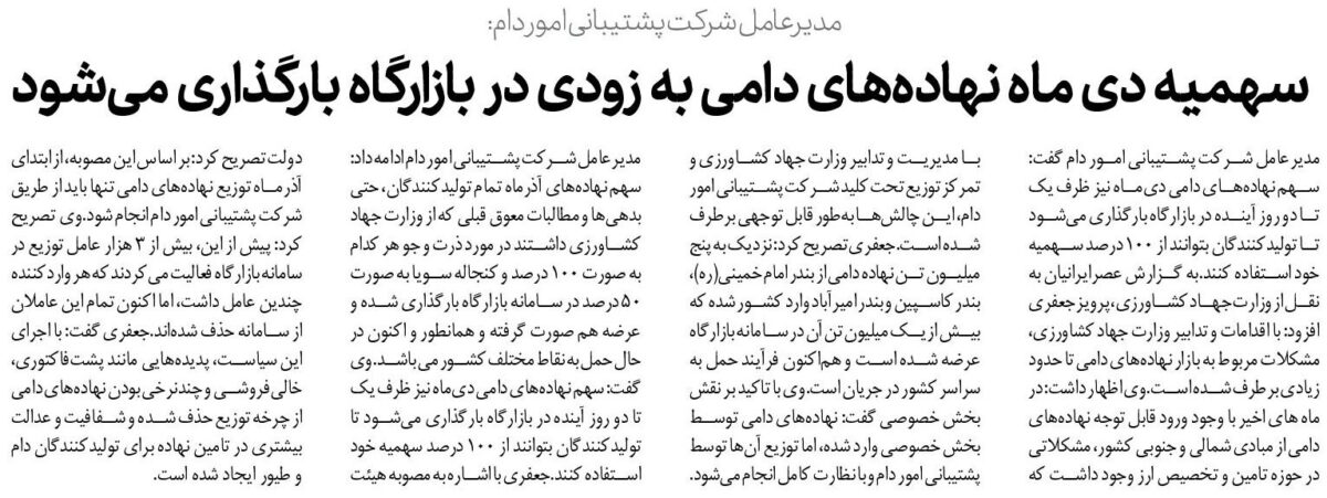 مدیرعامل شرکت پشتیبانی امور دام گفت: سهم نهادههای دامی دیماه نیز ظرف یک تا دو روز آینده در بازارگاه بارگذاری میشود تا تولیدکنندگان بتوانند از ۱۰۰ درصد سهمیه خود استفاده کنند.به گزارش عصرایرانیان به نقل از وزارت جهاد کشاورزی، پرویز جعفری افزود: با اقدامات و تدابیر وزارت جهاد کشاورزی، مشکلات مربوط به بازار نهادههای دامی تا حدود زیادی برطرف شده است.وی اظهار داشت: در ماه های اخیر با وجود ورود قابل توجه نهادههای دامی از مبادی شمالی و جنوبی کشور، مشکلاتی در حوزه تامین و تخصیص ارز وجود داشت که با مدیریت و تدابیر وزارت جهاد کشاورزی و تمرکز توزیع تحت کلید شرکت پشتیبانی امور دام، این چالشها بهطور قابل توجهی برطرف شده است.جعفری تصریح کرد: نزدیک به پنج میلیون تن نهاده دامی از بندر امام خمینی(ره)، بندر کاسپین و بندر امیرآباد وارد کشور شده که بیش از یک میلیون تن آن در سامانه بازارگاه عرضه شده است و هماکنون فرآیند حمل به سراسر کشور در جریان است.وی با تاکید بر نقش بخش خصوصی گفت: نهادههای دامی توسط بخش خصوصی وارد شده، اما توزیع آنها توسط پشتیبانی امور دام و با نظارت کامل انجام میشود.مدیرعامل شرکت پشتیبانی امور دام ادامه داد: سهم نهادههای آذرماه تمام تولیدکنندگان، حتی بدهیها و مطالبات معوق قبلی که از وزارت جهاد کشاورزی داشتند در مورد ذرت و جو هر کدام به صورت 100 درصد و کنجاله سویا به صورت 50 درصد در سامانه بازارگاه بارگذاری شده و عرضه هم صورت گرفته و همانطور و اکنون در حال حمل به نقاط مختلف کشور می باشد.وی گفت: سهم نهادههای دامی دیماه نیز ظرف یک تا دو روز آینده در بازارگاه بارگذاری میشود تا تولیدکنندگان بتوانند از ۱۰۰ درصد سهمیه خود استفاده کنند.جعفری با اشاره به مصوبه هیئت دولت تصریح کرد: بر اساس این مصوبه، از ابتدای آذرماه توزیع نهادههای دامی تنها باید از طریق شرکت پشتیبانی امور دام انجام شود.وی تصریح کرد: پیش از این، بیش از ۳ هزار عامل توزیع در سامانه بازارگاه فعالیت میکردند که هر واردکننده چندین عامل داشت، اما اکنون تمام این عاملان از سامانه حذف شدهاند.جعفری گفت: با اجرای این سیاست، پدیدههایی مانند پشتفاکتوری، خالیفروشی و چندنرخی بودن نهادههای دامی از چرخه توزیع حذف شده و شفافیت و عدالت بیشتری در تامین نهاده برای تولیدکنندگان دام و طیور ایجاد شده است.