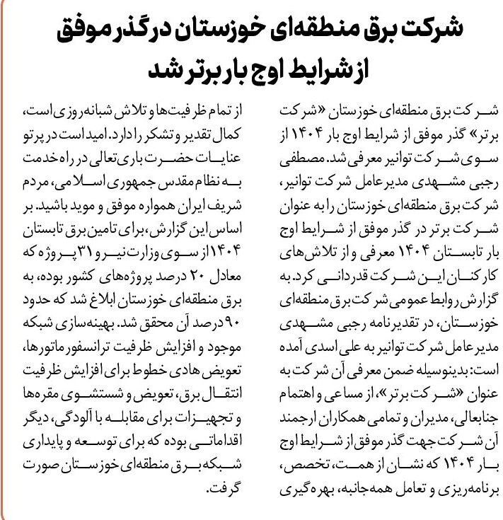 شرکت برق منطقهای خوزستان « شرکت برتر» گذر موفق از شرایط اوج بار ۱۴۰۴ از سوی شرکت توانیر معرفی شد. مصطفی رجبی مشهدی مدیرعامل شرکت توانیر، شرکت برق منطقهای خوزستان را به عنوان شرکت برتر در گذر موفق از شرایط اوج بار تابستان ۱۴۰۴ معرفی و از تلاشهای کارکنان این شرکت قدردانی کرد. به گزارش روابط عمومی شرکت برق منطقهای خوزستان، در تقدیرنامه رجبی مشهدی مدیرعامل شرکت توانیر به علی اسدی آمده است: بدینوسیله ضمن معرفی آن شرکت به عنوان «شرکت برتر»، از مساعی و اهتمام جنابعالی، مدیران و تمامی همکاران ارجمند آن شرکت جهت گذر موفق از شرایط اوج بار ۱۴۰۴ که نشان از همت، تخصص، برنامهریزی و تعامل همهجانبه، بهرهگیری از تمام ظرفیتها و تلاش شبانهروزی است، کمال تقدیر و تشکر را دارد. امید است در پرتو عنایات حضرت باریتعالی در راه خدمت به نظام مقدس جمهوری اسلامی، مردم شریف ایران همواره موفق و موید باشید. بر اساس این گزارش، برای تامین برق تابستان ۱۴۰۴ از سوی وزارت نیرو ۳۱ پروژه که معادل ۲۰ درصد پروژههای کشور بوده، به برق منطقهای خوزستان ابلاغ شد که حدود ۹۰ درصد آن محقق شد. بهینهسازی شبکه موجود و افزایش ظرفیت ترانسفورماتورها، تعویض هادی خطوط برای افزایش ظرفیت انتقال برق، تعویض و شستشوی مقرهها و تجهیزات برای مقابله با آلودگی، دیگر اقداماتی بوده که برای توسعه و پایداری شبکه برق منطقهای خوزستان صورت گرفت.