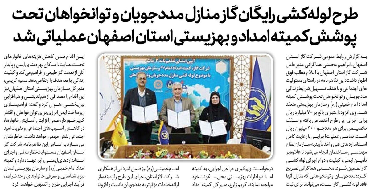 به گزارش روابط عمومی شرکت گاز استان اصفهان، ابراهیم محسنی هماگرانی مدیرعامل شرکت گاز استان اصفهان با اعلام مطلب فوق اظهار داشت: این تفاهمنامه در راستای مسئولیت های اجتماعی و با هدف تسهیل شرایط زندگی مددجویان و توانخواهان تحت پوشش کمیته امداد امام خمینی (ره) و سازمان بهزیستی منعقد شد. وی افزود: اعتباری بالغ بر ۷۰ میلیارد ریال برای اجرای این طرح اختصاص یافته و سقف تخصیص برای هر مددجو ۳۰۰ میلیون ریال است. تمامی عملیات اجرایی با رعایت کامل استانداردهای فنی و اخذ تأییدیه سازمان نظام مهندسی ساختمان انجام میشود تا علاوه بر تأمین ایمنی، کیفیت و دوام اجرای لولهکشی گاز تضمین شود. محسنی هماگرانی تصریح کرد: مددجویان و توانخواهانی که منازل آنها فاقد لولهکشی گاز است، میتوانند برای ثبت درخواست و پیگیری مراحل اجرایی، به کمیته امداد و ادارات بهزیستی محل سکونت خود مراجعه نمایند. کریم زارع، مدیرکل کمیته امداد امام خمینی(ره) نیز ضمن قدردانی از همکاری شرکت گاز استان، اجرای این طرح را زمینهساز ارائه خدمات مؤثرتر به مددجویان دانست و افزود: این اقدام ضمن کاهش هزینههای خانوارهای تحت حمایت، امکان بهرهمندی ایمن و پایدار آنان از نعمت گاز طبیعی را فراهم میکند و کیفیت زندگی جامعه هدف را ارتقا میدهد. سمیه کریمی، مدیرکل سازمان بهزیستی استان اصفهان نیز این اقدام را مصداقی از هماندیشی و همافزایی بینبخشی عنوان کرد و گفت: فراهمسازی زیرساخت ایمن انرژی برای توانخواهان و اقشار کمبرخوردار، ضمن افزایش آسایش خانوارها، در کاهش آسیبهای اجتماعی و تقویت امید اجتماعی نقش مهمی خواهد داشت. خاطرنشان می سازد بر اساس این تفاهمنامه، شرکت گاز استان اصفهان مسئولیت نظارت فنی و اجرای استانداردهای ایمنی را بر عهده دارد و کمیته امداد امام خمینی(ره) و سازمان بهزیستی استان نیز با شناسایی و معرفی خانوارهای واجد شرایط، فرآیند اجرایی طرح را تسهیل خواهند کرد.