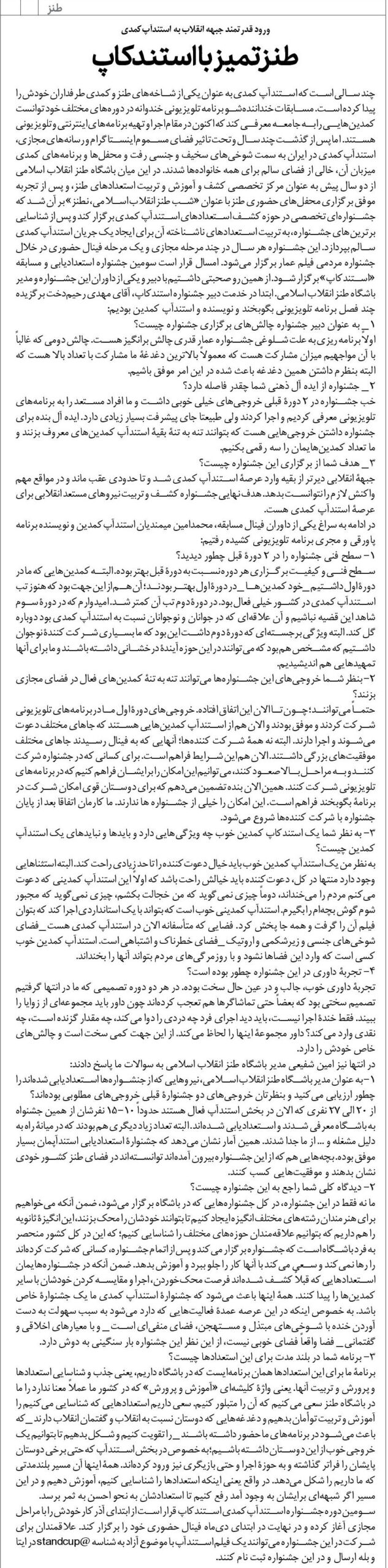 چند سالی است که استندآپ کمدی به عنوان یکی از شاخه‌های طنز و کمدی طرفداران خودش را پیدا کرده است. مسابقات خنداننده‌شو برنامه تلویزیونی خندوانه در دوره‌های مختلف خود توانست کمدین‌هایی را به جامعه معرفی کند که اکنون در مقام اجرا و تهیه برنامه‌های اینترنتی و تلویزیونی هستند. اما پس از گذشت چند سال و تحت تاثیر فضای مسموم اینستاگرام و رسانه‌های مجازی، استندآپ‌کمدی در ایران به سمت شوخی‌های سخیف و جنسی رفت و محفل‌ها و برنامه‌های کمدی میزبان آن، خالی از فضای سالم برای همه خانواده‌ها شدند. در این میان باشگاه طنز انقلاب اسلامی از دو سال پیش به عنوان مرکز تخصصی کشف و آموزش و تربیت استعدادهای طنز، و پس از تجربه موفق برگزاری محفل‌های حضوری طنز با عنوان «شب طنز انقلاب اسلامی، نطنز» بر آن شد که جشنواره‌ای تخصصی در حوزه کشف استعدادهای استندآپ کمدی برگزار کند و پس از شناسایی برترین‌های جشنواره، به تربیت استعدادهای ناشناخته آن برای ایجاد یک جریان استندآپ‌کمدی سالم بپردازد. این جشنواره هر سال در چند مرحله مجازی و یک مرحله فینال حضوری در خلال جشنواره مردمی فیلم عمار برگزار می‌‌شود. امسال قرار است سومین جشنواره استعدادیابی و مسابقه «استندکاپ» برگزار ‌شود. از همین رو صحبتی داشتیم با دبیر و یکی از داوران این جشنواره و مدیر باشگاه طنز انقلاب اسلامی. ابتدا در خدمت دبیر جشنواره استندکاپ، آقای مهدی رحیم‌دخت برگزیده چند فصل برنامه تلویزیونی بگوبخند و نویسنده و استندآپ کمدین بودیم: