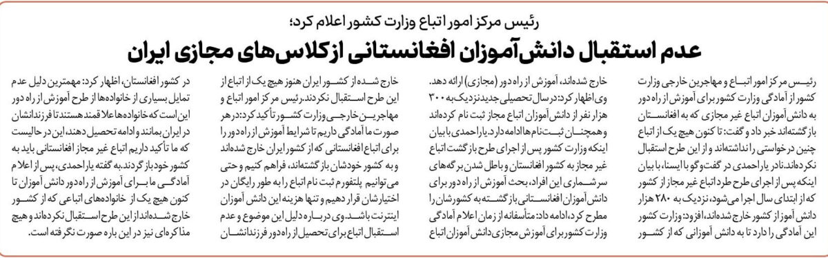 رئیس مرکز امور اتباع و مهاجرین خارجی وزارت کشور از آمادگی وزارت کشور برای آموزش از راه دور به دانشآموزان اتباع غیر مجازی که به افغانستان بازگشتهاند خبر داد و گفت: تا کنون هیچ یک از اتباع چنین درخواستی را نداشتهاند و از این طرح استقبال نکردهاند.نادر یاراحمدی در گفتوگو با ایسنا، با بیان اینکه پس از اجرای طرح طرد اتباع غیر مجاز از کشور که از ابتدای سال اجرا میشود، نزدیک به ۲۸۰ هزار دانش آموز از کشور خارج شدهاند، افزود: وزارت کشور این آمادگی را دارد تا به دانش آموزانی که از کشور خارج شدهاند، آموزش از راه دور (مجازی) ارائه دهد.وی اظهار کرد: در سال تحصیلی جدید نزدیک به ۳۰۰ هزار نفر از دانشآموزان اتباع مجاز ثبت نام کردهاند و همچنان ثبت نام ها ادامه دارد.یاراحمدی با بیان اینکه وزارت کشور پس از اجرای طرح بازگشت اتباع غیر مجاز به کشور افغانستان و باطل شدن برگههای سرشماری این افراد، بحث آموزش از راه دور برای دانشآموزان افغانستانی بازگشته به کشورشان را مطرح کرد، ادامه داد: متأسفانه از زمان اعلام آمادگی وزارت کشور برای آموزش مجازی دانش آموزان اتباع خارج شده از کشور ایران هنوز هیچ یک از اتباع از این طرح استقبال نکردند.رئیس مرکز امور اتباع و مهاجرین خارجی وزارت کشور تأکید کرد: در هر صورت ما آمادگی داریم تا شرایط آموزش از راه دور را برای اتباع افغانستانی که از کشور ایران خارج شدهاند و به کشور خودشان بازگشتهاند، فراهم کنیم و حتی میتوانیم پلتفورم ثبت نام اتباع را به طور رایگان در اختیارشان قرار دهیم و تنها هزینه این دانش آموزان اینترنت باشد.وی درباره دلیل این موضوع و عدم استقبال اتباع برای تحصیل از راه دور فرزندانشان در کشور افغانستان، اظهار کرد: مهمترین دلیل عدم تمایل بسیاری از خانوادهها از طرح آموزش از راه دور این است که خانواده ها علاقمند هستند تا فرزندانشان در ایران بمانند و ادامه تحصیل دهند، این در حالیست که ما تأکید داریم اتباع غیر مجاز افغانستانی باید به کشور خود بازگردند.به گفته یاراحمدی، پس از اعلام آمادگی ما برای آموزش از راه دور دانش آموزان تا کنون هیچ یک از خانوادههای اتباعی که از کشور خارج شدهاند از این طرح استقبال نکردهاند و هیچ مذاکرهای نیز در این باره صورت نگرفته است.