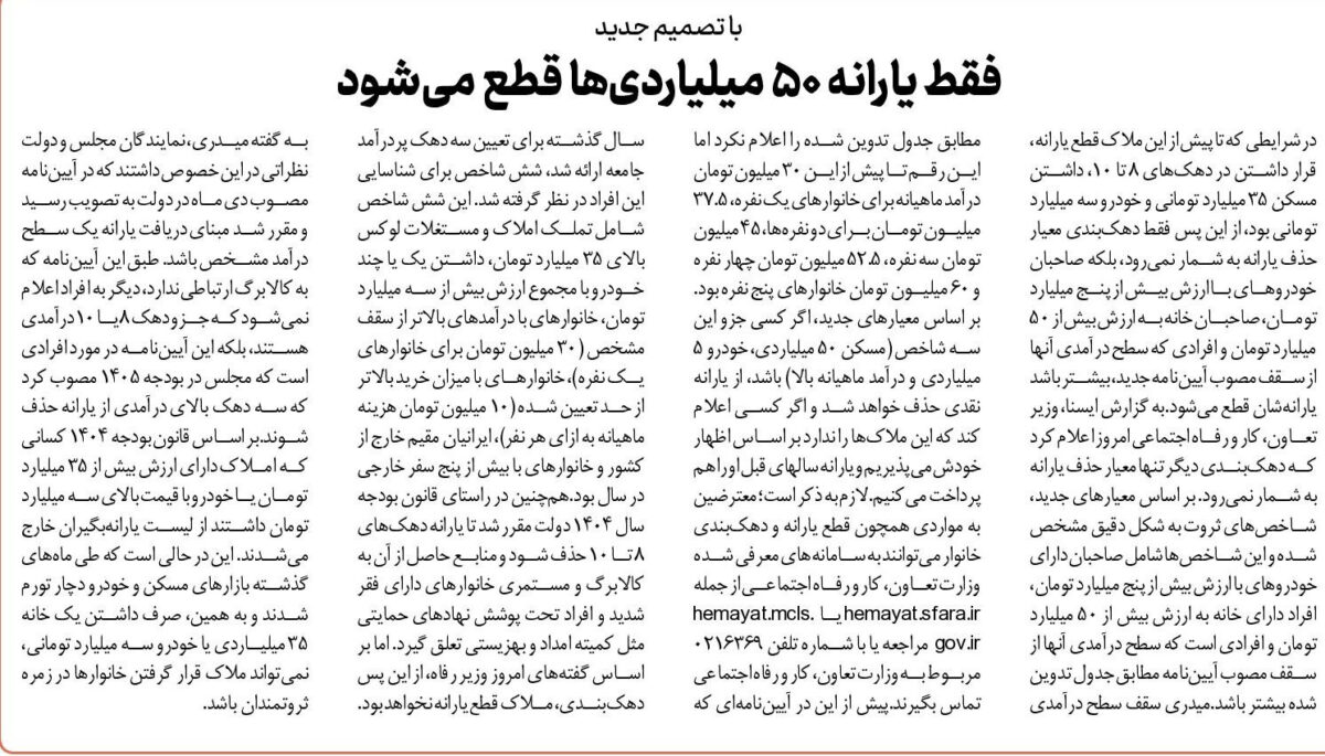 در شرایطی که تا پیش از این ملاک قطع یارانه، قرار داشتن در دهکهای ۸ تا ۱۰، داشتن مسکن ۳۵ میلیارد تومانی و خودرو سه میلیارد تومانی بود، از این پس فقط دهکبندی معیار حذف یارانه به شمار نمیرود، بلکه صاحبان خودروهای با ارزش بیش از پنج میلیارد تومان، صاحبان خانه به ارزش بیش از ۵۰ میلیارد تومان و افرادی که سطح درآمدی آنها از سقف مصوب آییننامه جدید، بیشتر باشد یارانهشان قطع میشود.به گزارش ایسنا، وزیر تعاون، کار و رفاه اجتماعی امروز اعلام کرد که دهکبندی دیگر تنها معیار حذف یارانه به شمار نمیرود. بر اساس معیارهای جدید، شاخصهای ثروت به شکل دقیق مشخص شده و این شاخصها شامل صاحبان دارای خودروهای با ارزش بیش از پنج میلیارد تومان، افراد دارای خانه به ارزش بیش از ۵۰ میلیارد تومان و افرادی است که سطح درآمدی آنها از سقف مصوب آییننامه مطابق جدول تدوین شده بیشتر باشد.میدری سقف سطح درآمدی مطابق جدول تدوین شده را اعلام نکرد اما این رقم تا پیش از این ۳۰ میلیون تومان درآمد ماهیانه برای خانوارهای یک نفره، ۳۷.۵ میلیون تومان برای دو نفرهها، ۴۵ میلیون تومان سه نفره، ۵۲.۵ میلیون تومان چهار نفره و ۶۰ میلیون تومان خانوارهای پنج نفره بود.بر اساس معیارهای جدید، اگر کسی جزو این سه شاخص (مسکن ۵۰ میلیاردی، خودرو ۵ میلیاردی و درآمد ماهیانه بالا) باشد، از یارانه نقدی حذف خواهد شد و اگر کسی اعلام کند که این ملاکها را ندارد بر اساس اظهار خودش میپذیریم و یارانه سالهای قبل او را هم پرداخت میکنیم.لازم به ذکر است؛ معترضین به مواردی همچون قطع یارانه و دهکبندی خانوار میتوانند به سامانههای معرفی شده وزارت تعاون، کار و رفاه اجتماعی از جمله hemayat.sfara.ir یا hemayat.mcls.gov.ir مراجعه یا با شماره تلفن ۰۲۱۶۳۶۹ مربوط به وزارت تعاون، کار و رفاه اجتماعی تماس بگیرند.پیش از این در آییننامهای که سال گذشته برای تعیین سه دهک پردرآمد جامعه ارائه شد، شش شاخص برای شناسایی این افراد در نظر گرفته شد. این شش شاخص شامل تملک املاک و مستغلات لوکس بالای ۳۵ میلیارد تومان، داشتن یک یا چند خودرو با مجموع ارزش بیش از سه میلیارد تومان، خانوارهای با درآمدهای بالاتر از سقف مشخص (۳۰ میلیون تومان برای خانوارهای یک نفره)، خانوارهای با میزان خرید بالاتر از حد تعیین شده (۱۰ میلیون تومان هزینه ماهیانه به ازای هر نفر)، ایرانیان مقیم خارج از کشور و خانوارهای با بیش از پنج سفر خارجی در سال بود.همچنین در راستای قانون بودجه سال ۱۴۰۴ دولت مقرر شد تا یارانه دهکهای ۸ تا ۱۰ حذف شود و منابع حاصل از آن به کالابرگ و مستمری خانوارهای دارای فقر شدید و افراد تحت پوشش نهادهای حمایتی مثل کمیته امداد و بهزیستی تعلق گیرد. اما بر اساس گفتههای امروز وزیر رفاه، از این پس دهکبندی، ملاک قطع یارانه نخواهد بود.به گفته میدری، نمایندگان مجلس و دولت نظراتی در این خصوص داشتند که در آییننامه مصوب دی ماه در دولت به تصویب رسید و مقرر شد مبنای دریافت یارانه یک سطح درآمد مشخص باشد. طبق این آییننامه که به کالابرگ ارتباطی ندارد، دیگر به افراد اعلام نمیشود که جزو دهک ۸ یا ۱۰ درآمدی هستند، بلکه این آییننامه در مورد افرادی است که مجلس در بودجه ۱۴۰۵ مصوب کرد که سه دهک بالای درآمدی از یارانه حذف شوند.بر اساس قانون بودجه ۱۴۰۴ کسانی که املاک دارای ارزش بیش از ۳۵ میلیارد تومان یا خودرو با قیمت بالای سه میلیارد تومان داشتند از لیست یارانهبگیران خارج میشدند. این در حالی است که طی ماههای گذشته بازارهای مسکن و خودرو دچار تورم شدند و به همین، صرف داشتن یک خانه ۳۵ میلیاردی یا خودرو سه میلیارد تومانی، نمیتواند ملاک قرار گرفتن خانوارها در زمره ثروتمندان باشد.