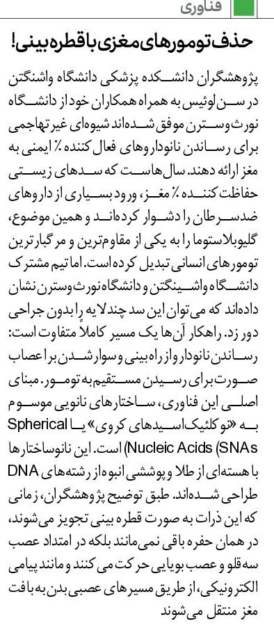پژوهشگران دانشکده پزشکی دانشگاه واشنگتن در سنلوئیس به همراه همکاران خود از دانشگاه نورثوسترن موفق شدهاند شیوهای غیرتهاجمی برای رساندن نانوداروهای فعالکنندهٔ ایمنی به مغز ارائه دهند. سالهاست که سدهای زیستی حفاظتکنندهٔ مغز، ورود بسیاری از داروهای ضدسرطان را دشوار کردهاند و همین موضوع، گلیوبلاستوما را به یکی از مقاومترین و مرگبارترین تومورهای انسانی تبدیل کرده است. اما تیم مشترک دانشگاه واشینگتن و دانشگاه نورثوسترن نشان دادهاند که میتوان این سد چندلایه را بدون جراحی دور زد. راهکار آنها یک مسیر کاملاً متفاوت است: رساندن نانودارو از راه بینی و سوارشدن بر اعصاب صورت برای رسیدن مستقیم به تومور. مبنای اصلی این فناوری، ساختارهای نانویی موسوم به «نوکلئیکاسیدهای کروی» یا Spherical Nucleic Acids (SNAs) است. این نانوساختارها با هستهای از طلا و پوششی انبوه از رشتههای DNA طراحی شدهاند. طبق توضیح پژوهشگران، زمانی که این ذرات به صورت قطره بینی تجویز میشوند، در همان حفره باقی نمیمانند بلکه در امتداد عصب سهقلو و عصب بویایی حرکت میکنند و مانند پیامی الکترونیکی، از طریق مسیرهای عصبی بدن به بافت مغز منتقل میشوند