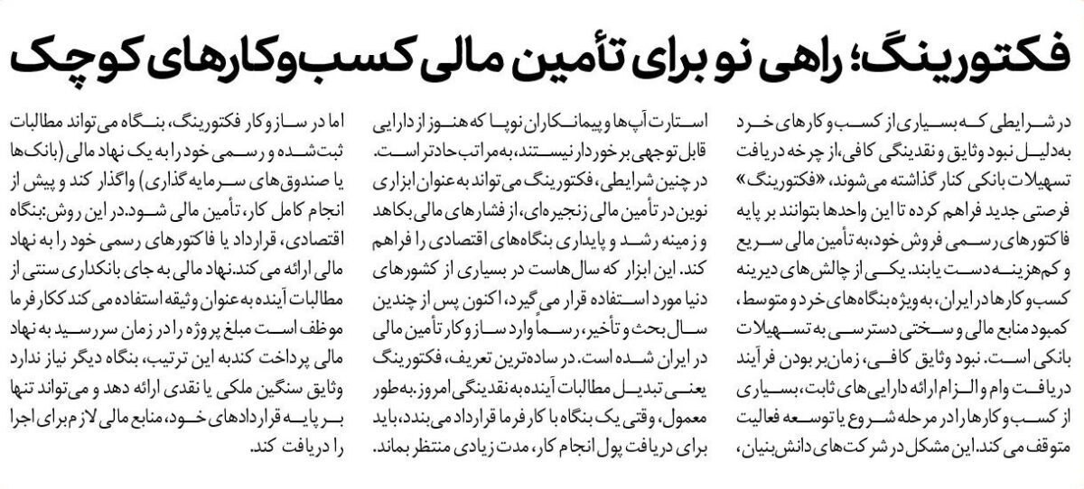 در شرایطی که بسیاری از کسبوکارهای خرد بهدلیل نبود وثایق و نقدینگی کافی،از چرخه دریافت تسهیلات بانکی کنار گذاشته میشوند، «فکتورینگ» فرصتی جدید فراهم کرده تا این واحدها بتوانند بر پایه فاکتورهای رسمی فروش خود،به تأمین مالی سریع و کمهزینه دست یابند. یکی از چالشهای دیرینه کسبوکارها در ایران، بهویژه بنگاههای خرد و متوسط، کمبود منابع مالی و سختی دسترسی به تسهیلات بانکی است. نبود وثایق کافی، زمانبر بودن فرآیند دریافت وام و الزام ارائه داراییهای ثابت، بسیاری از کسبوکارها را در مرحله شروع یا توسعه فعالیت متوقف میکند. این مشکل در شرکتهای دانشبنیان، استارتآپها و پیمانکاران نوپا که هنوز از دارایی قابلتوجهی برخوردار نیستند، بهمراتب حادتر است.در چنین شرایطی، فکتورینگ میتواند بهعنوان ابزاری نوین در تأمین مالی زنجیرهای، از فشارهای مالی بکاهد و زمینه رشد و پایداری بنگاههای اقتصادی را فراهم کند. این ابزار که سالهاست در بسیاری از کشورهای دنیا مورد استفاده قرار میگیرد، اکنون پس از چندین سال بحث و تأخیر، رسماً وارد سازوکار تأمین مالی در ایران شده است. در سادهترین تعریف، فکتورینگ یعنی تبدیل مطالبات آینده به نقدینگی امروز.بهطور معمول، وقتی یک بنگاه با کارفرما قرارداد میبندد، باید برای دریافت پول انجام کار، مدت زیادی منتظر بماند. اما در سازوکار فکتورینگ، بنگاه میتواند مطالبات ثبتشده و رسمی خود را به یک نهاد مالی (بانکها یا صندوقهای سرمایهگذاری) واگذار کند و پیش از انجام کامل کار، تأمین مالی شود.در این روش:بنگاه اقتصادی، قرارداد یا فاکتورهای رسمی خود را به نهاد مالی ارائه میکند.نهاد مالی به جای بانکداری سنتی از مطالبات آینده بهعنوان وثیقه استفاده میکندککارفرما موظف است مبلغ پروژه را در زمان سررسید به نهاد مالی پرداخت کندبه این ترتیب، بنگاه دیگر نیاز ندارد وثایق سنگین ملکی یا نقدی ارائه دهد و میتواند تنها بر پایه قراردادهای خود، منابع مالی لازم برای اجرا را دریافت کند.