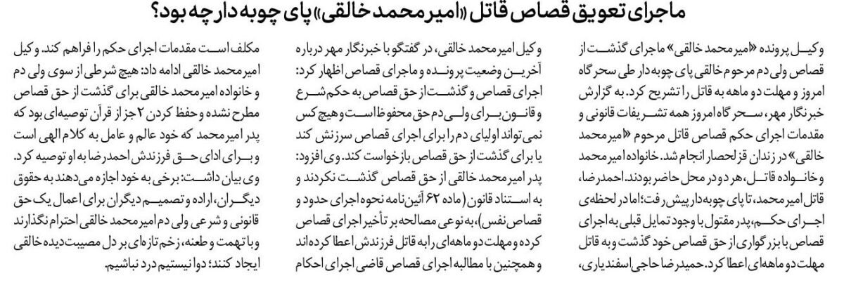 وکیل پرونده «امیرمحمد خالقی» ماجرای گذشت از قصاص ولی دم مرحوم خالقی پای چوبه دار طی سحرگاه امروز و مهلت دو ماهه به قاتل را تشریح کرد. به گزارش خبرنگار مهر، سحرگاه امروز همه تشریفات قانونی و مقدمات اجرای حکم قصاص قاتل مرحوم «امیرمحمد خالقی» در زندان قزلحصار انجام شد. خانواده امیرمحمد و خانواده قاتل، هر دو در محل حاضر بودند. احمدرضا، قاتل امیرمحمد، تا پای چوبهدار پیش رفت؛ اما در لحظهی اجرای حکم، پدر مقتول با وجود تمایل قبلی به اجرای قصاص با بزرگواری از حق قصاص خود گذشت و به قاتل مهلت دو ماههای اعطا کرد. حمیدرضا حاجیاسفندیاری، وکیل امیرمحمد خالقی، در گفتگو با خبرنگار مهر درباره آخرین وضعیت پرونده و ماجرای قصاص اظهار کرد: اجرای قصاص و گذشت از حق قصاص به حکم شرع و قانون برای ولی دم حق محفوظ است و هیچکس نمیتواند اولیای دم را برای اجرای قصاص سرزنش کند یا برای گذشت از حق قصاص بازخواست کند. وی افزود: پدر امیرمحمد خالقی از حق قصاص گذشت نکردند و به استناد قانون (ماده ۶۲ آئیننامه نحوه اجرای حدود و قصاص نفس)، به نوعی مصالحه بر تأخیر اجرای قصاص کرده و مهلت دو ماههای را به قاتل فرزندش اعطا کرده اند و همچنین با مطالبه اجرای قصاص قاضی اجرای احکام مکلف است مقدمات اجرای حکم را فراهم کند. وکیل امیرمحمد خالقی ادامه داد: هیچ شرطی از سوی ولی دم و خانواده امیرمحمد خالقی برای گذشت از حق قصاص مطرح نشده و حفظ کردن ۲ جز از قرآن توصیهای بود که پدر امیرمحمد که خود عالم و عامل به کلام الهی است و برای ادای حق فرزندش احمدرضا به او توصیه کرد. وی بیان داشت: برخی به خود اجازه میدهند به حقوق دیگران، اراده و تصمیم دیگران برای اعمال یک حق قانونی و شرعی ولی دم امیرمحمد خالقی احترام نگذارند و با تهمت و طعنه، زخم تازهای بر دل مصیبتدیده خالقی ایجاد کنند؛ دوا نیستیم درد نباشیم.