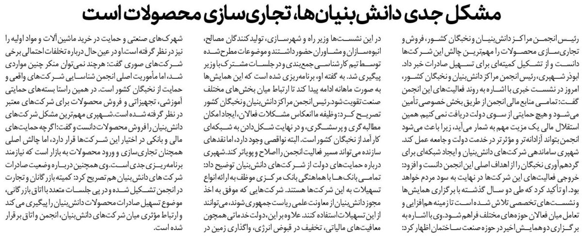 رئیس انجمن مراکز دانش‌بنیان و نخبگان کشور، فروش و تجاری‌سازی محصولات را مهم‌ترین چالش این شرکت‌ها دانست و از تشکیل کمیته‌ای برای تسهیل صادرات خبر داد.ابوذر شهپری، رئیس انجمن مراکز دانش‌بنیان و نخبگان کشور، امروز در نشست خبری با اشاره به روند فعالیت‌های این انجمن گفت: تمامی منابع مالی انجمن از طریق بخش خصوصی تأمین می‌شود و هیچ حمایتی از سوی دولت دریافت نمی‌کنیم. همین استقلال مالی یک مزیت مهم به شمار می‌آید، زیرا باعث می‌شود انجمن بتواند آزادانه‌تر و مؤثرتر در خدمت دولت و جامعه عمل کند.شهپری ساماندهی شرکت‌های دانش‌بنیان و ایجاد شبکه‌ای برای گردهم‌آوری نخبگان را از اهداف اصلی این انجمن دانست و افزود: خروجی فعالیت‌های این شرکت‌ها در نهایت به سود مردم خواهد بود. او تأکید کرد که طی دو سال گذشته با برگزاری همایش‌ها و نشست‌های تخصصی تلاش شده است تا زمینه هم‌افزایی و تعامل میان فعالان حوزه‌های مختلف فراهم شود.وی با اشاره به برگزاری دو همایش اخیر در حوزه صنعت ساختمان اظهار کرد: در این نشست‌ها وزیر راه و شهرسازی، تولیدکنندگان مصالح، انبوه‌سازان و مشاوران حضور داشتند و موضوعات مطرح‌شده توسط تیم کارشناسی جمع‌بندی و در جلسات مشترک با وزیر پیگیری شد. به گفته او، برنامه‌ریزی شده است که این همایش‌ها به صورت ماهانه ادامه پیدا کند تا ارتباط میان بخش‌های مختلف صنعت تقویت شود.رئیس انجمن مراکز دانش‌بنیان و نخبگان کشور تصریح کرد: وظیفه ما انعکاس مشکلات فعالان، ایجاد امکان مطالبه‌گری و پرسشگری، و در نهایت شکل‌دادن به شبکه‌ای کارآمد از نخبگان کشور است. البته نواقصی وجود دارد، اما نقدهای سازنده می‌تواند مسیر فعالیت انجمن را اصلاح و پویاتر کند.شهپری درباره حمایت‌های دولت از شرکت‌های دانش‌بنیان توضیح داد: تمامی بانک‌ها با هماهنگی بانک مرکزی موظف به ارائه انواع تسهیلات به این شرکت‌ها هستند. شرکت‌هایی که موفق به اخذ مجوز دانش‌بنیان از معاونت علمی ریاست جمهوری شوند، می‌توانند از این تسهیلات استفاده کنند. علاوه بر این، دولت خدماتی همچون معافیت‌های مالیاتی، تخفیف در قبوض انرژی، واگذاری زمین در شهرک‌های صنعتی و حمایت در خرید ماشین‌آلات و مواد اولیه را نیز در نظر گرفته است.او در عین حال درباره تخلفات احتمالی برخی شرکت‌های صوری گفت: هرچند نمی‌توان منکر چنین مواردی شد، اما مأموریت اصلی انجمن شناسایی شرکت‌های واقعی و حمایت از نخبگان کشور است. در همین راستا بسته‌های حمایتی آموزشی، تجهیزاتی و فروش محصولات برای شرکت‌های معتبر در نظر گرفته شده است.شهپری مهم‌ترین مشکل شرکت‌های دانش‌بنیان را فروش محصولات دانست و گفت: اگرچه حمایت‌های مالی و بانکی در اختیار این شرکت‌ها قرار دارد، اما چالش اصلی همچنان تجاری‌سازی و ورود محصولات به بازار است که نیازمند برنامه‌ریزی جدی است.وی همچنین درباره وضعیت صادرات شرکت های دانش بنیان هم تصریح کرد: کمیته بازرگانان و تجارت در انجمن تشکیل شده و در پی جلسات متعدد با اتاق بازرگانی، موضوع تسهیل صادرات محصولات دانش‌بنیان را پیگیری می‌کند و ارتباط مؤثری میان شرکت‌های دانش‌بنیان، انجمن و اتاق برقرار شده است.