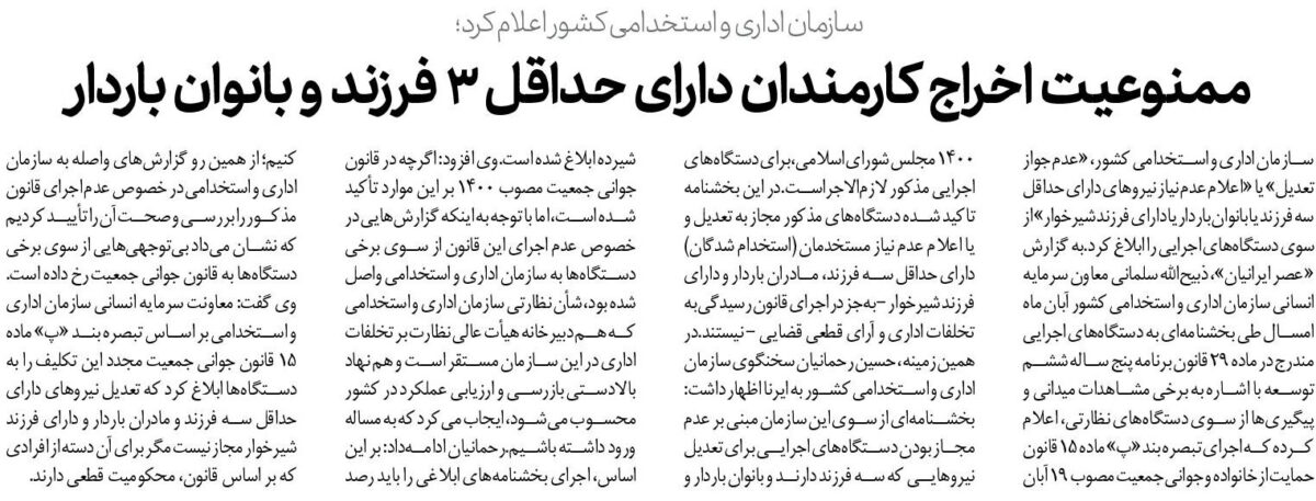 سازمان اداری و استخدامی کشور، «عدم جواز تعدیل» یا «اعلام عدم نیاز نیروهای دارای حداقل سه فرزند یا بانوان باردار یا دارای فرزند شیرخوار» از سوی دستگاههای اجرایی را ابلاغ کرد.به گزارش «عصر ایرانیان»، ذبیحالله سلمانی معاون سرمایه انسانی سازمان اداری و استخدامی کشور آبان ماه امسال طی بخشنامهای به دستگاههای اجرایی مندرج در ماده ۲۹ قانون برنامه پنج ساله ششم توسعه با اشاره به برخی مشاهدات میدانی و پیگیریها از سوی دستگاههای نظارتی، اعلام کرده که اجرای تبصره بند «پ» ماده ۱۵ قانون حمایت از خانواده و جوانی جمعیت مصوب ۱۹ آبان ۱۴۰۰ مجلس شورای اسلامی، برای دستگاههای اجرایی مذکور لازمالاجراست.در این بخشنامه تاکید شده دستگاههای مذکور مجاز به تعدیل و یا اعلام عدم نیاز مستخدمان (استخدام شدگان) دارای حداقل سه فرزند، مادران باردار و دارای فرزند شیرخوار – بهجز در اجرای قانون رسیدگی به تخلفات اداری و آرای قطعی قضایی – نیستند.در همین زمینه، حسین رحمانیان سخنگوی سازمان اداری و استخدامی کشور به ایرنا اظهار داشت: بخشنامهای از سوی این سازمان مبنی بر عدم مجاز بودن دستگاههای اجرایی برای تعدیل نیروهایی که سه فرزند دارند و بانوان باردار و شیرده ابلاغ شده است.وی افزود: اگرچه در قانون جوانی جمعیت مصوب ۱۴۰۰ بر این موارد تأکید شده است، اما با توجه به اینکه گزارشهایی در خصوص عدم اجرای این قانون از سوی برخی دستگاهها به سازمان اداری و استخدامی واصل شده بود، شأن نظارتی سازمان اداری و استخدامی که هم دبیرخانه هیأت عالی نظارت بر تخلفات اداری در این سازمان مستقر است و هم نهاد بالادستی بازرسی و ارزیابی عملکرد در کشور محسوب میشود، ایجاب میکرد که به مساله ورود داشته باشیم.رحمانیان ادامهداد: بر این اساس، اجرای بخشنامههای ابلاغی را باید رصد کنیم؛ از همین رو گزارشهای واصله به سازمان اداری و استخدامی در خصوص عدم اجرای قانون مذکور را بررسی و صحت آن را تأیید کردیم که نشان میداد بیتوجهیهایی از سوی برخی دستگاهها به قانون جوانی جمعیت رخ داده است.وی گفت: معاونت سرمایه انسانی سازمان اداری و استخدامی بر اساس تبصره بند «پ» ماده ۱۵ قانون جوانی جمعیت مجدد این تکلیف را به دستگاهها ابلاغ کرد که تعدیل نیروهای دارای حداقل سه فرزند و مادران باردار و دارای فرزند شیرخوار مجاز نیست مگر برای آن دسته از افرادی که بر اساس قانون، محکومیت قطعی دارند.