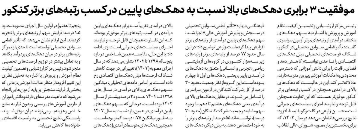 رئیس مرکز ارزشیابی و تضمین کیفیت نظام آموزش و پرورش با اشاره به سهم دهکهای مختلف درآمدی از رتبههای برتر آزمون سراسری گفت: تأثیر قطعی سوابق تحصیلی در کنکور، شکاف فرصتهای تحصیلی میان دهکهای اقتصادی را تا حدی توانسته کاهش دهد و فضای رقابت را برای دانشآموزانی که دسترسی محدودی به امکانات آموزشی بیرون مدرسه دارند، عادلانهتر کند. این در حالیست که دهکهای بالای درآمدی همچنان در کسب رتبههای برتر کنکور موفقتر هستند که این تفاوت همچنان قابل توجه و نیازمند اجرای سیاستهای جبرانی است.محسن زارعی در گفتوگو با ایسنا، افزود: نتایج بررسیها نشان میدهد در سال ۱۴۰۲، که برای نخستین بار مصوبه شورای عالی انقلاب فرهنگی درباره «تأثیر قطعی سوابق تحصیلی در سنجش و پذیرش آموزش عالی» اجرا شد، سهم دهکهای پایین درآمدی از رتبههای برتر افزایش پیدا کرده است.زارعی توضیح داد: در این سال حدود ۱۷ درصد از رتبههای برتر (رتبههای زیر سههزار کشوری در گروههای آزمایشی ریاضی، تجربی و انسانی) متعلق به دهکهای درآمدی پایین، یعنی دهکهای اول تا چهارم بوده است. این گروه از نظر جمعیت، حدود ۳۰ درصد از کل شرکتکنندگان در آزمون سراسری را شامل میشوند. در مقابل، دهکهای بالای درآمدی یعنی دهکهای هشتم تا دهم، با وجود سهم مشابه در جمعیت شرکتکنندگان (حدود ۳۰ درصد)، توانستهاند ۵۵ درصد از رتبههای برتر را به خود اختصاص دهند. به بیان دیگر، دهکهای بالای درآمدی تقریباً سه برابر دهکهای پایین درآمدی در کسب رتبههای برتر موفقتر بودهاند که این تفاوت همچنان قابل توجه و نیازمند اجرای سیاستهای جبرانی است.وی ادامه داد: با این حال، مقایسه همین شاخص در بازه پنجساله ۱۳۹۸ تا ۱۴۰۲ نشان میدهد که در سال اجرای مصوبه (۱۴۰۲)، تغییراتی در جهت کاهش شکاف فرصتها میان دهکهای اقتصادی رخ داده است. بر اساس دادههای تحلیلی، میانگین سهم دهکهای بالای درآمدی در سالهای ۱۳۹۸ تا ۱۴۰۱ حدود ۲ درصد بیشتر از سال ۱۴۰۲ بوده است، درحالیکه سهم دهکهای پایین درآمدی در همین بازه نسبت به سال ۱۴۰۲ به طور میانگین ۰.۷۵ درصد کمتر بوده است. همچنین دهکهای متوسط درآمدی (دهکهای پنجم تا هفتم) در اولین سال اجرای مصوبه، حدود ۱.۵ درصد افزایش سهم از رتبههای برتر را تجربه کردهاند. این ارقام نشان میدهد که تأثیر قطعی سوابق تحصیلی توانسته است تا حدی از تمرکز رتبههای برتر در میان دهکهای پردرآمد بکاهد و به تعادل بیشتر در توزیع فرصتهای تحصیلی منجر شود.رئیس مرکز ارزشیابی و تضمین کیفیت نظام آموزش و پرورش با اشاره به تحلیل نظری این تغییر افزود: از منظر عدالت آموزشی، زمانی که بخشی از فرایند سنجش بر پایه آزمونهایی انجام میشود که ماهیت مدرسهای دارند و دانشآموزان از طریق آموزشهای رسمی و بدون نیاز به منابع خاص و هزینهبر میتوانند در آن موفق شوند، وابستگی نتایج تحصیلی به وضعیت اقتصادی خانوادهها کاهش مییابد.