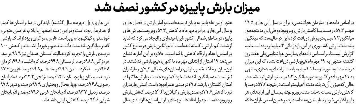 بر اساس دادههای سازمان هواشناسی، ایران در سال آبی جاری تا ۱۹ مهر ۵۷.۳ درصد با کاهش بارش روبرو بوده و طی این مدت بهطور میانگین ۱.۳ میلیمتر بارش دریافت کرده این در حالیست که میانگین بلندمدت بارش کشوری در این بازه زمانی ۳ میلیمتر بوده است.به گزارش ایسنا، بر اساس دادههای سازمان هواشناسی طی هفت روز گذشته منتهی به ۱۹ مهرماه هیچ بارشی دریافت نشده که این میزان در بلندمدت بهطور متوسط ۱.۱ میلیمتر است.از ابتدای ماه جاری منتهی به ۱۹ مهرماه در کشور بهطور میانگین ۱.۳ میلیمتر بارش ثبت شده، در حالی که میزان آن در بلندمدت ۳ میلیمتر است. در نتیجه ۵۷.۳ درصد با کاهش بارش نسبت به بلند مدت روبرو بودهایم.سال آبی از ابتدای هر پاییز آغاز میشود و تا تابستان بعد ادامه دارد. بر همین اساس، از آنجا که هنوز اولین ماه پاییز به پایان نرسیده است و آمار بارش در فصل جاری و سال آبی جاری برابر با مهرماه، با کاهش ۵۷.۳ روبروست.بارشهای پاییزه در مناطق شمالی کشور، این امیدواری را ایجاد میکرد که شاید از شدت کم بارشی، کاسته شده است اما میانگین بارش در سطح کشور بر اساس اعداد و ارقام کاهش یافته است . علاوه بر این آمارها نشان میدهد ۱۹ استان از ابتدای مهرماه تا کنون، هیچ بارشی نداشتند. در این میان بر خلاف تصور بارش در استانهای شمالی گیلان و مازندران نیز نسبت به میانگین بلندمدت خود کمتر بوده است و بارشها تنها در استان گلستان، با رشد ۲۹.۳ درصدی همراه بوده است. استان مازندران نیز با کاهش ۳۱.۶ درصدی بارش و گیلان با ۵۴.۴ درصد کاهش بارش روبرو بوده است. جدول اطلاعات پهنهای بارش استانها از ابتدای سال آبی جاری (اول مهرماه سال گذشته) بارندگی در سایر استانها کمتر از حد نرمال بوده است و در این زمینه اصفهان، ایلام، خراسان جنوبی، خوزستان، کهگیلویه و بویراحمد، فارس، مرکزی و یزد از اندک بارشی که در میانگین بلند مدت داشتند هم برخوردار نشدند و کاهش ۱۰۰ درصدی بارش را تجربه کردند.البته استان همدان نیز ۹۹.۹ درصد، هرمزگان ۹۸.۹ درصد، لرستان ۹۹.۹ درصد، کرمانشاه ۹۹.۲، کرمان ۹۶.۸ درصد، کردستان ۹۹.۹ درصد، قم ۹۹.۸ درصد، قزوین ۹۷.۶ درصد، سیستان و بلوچستان ۹۳.۹ درصد، زنجان ۹۳.۳ درصد، خراسان رضوی ۹۶.۸ درصد، چهارمحال و بختیاری ۹۹.۹ درصد، بوشهر ۹۹.۹ درصد، اردبیل ۹۳.۷ درصد، آذربایجان غربی ۹۹.۶ درصد و آذربایجان شرقی ۹۴.۶ درصد کاهش بارش داشتهاند.