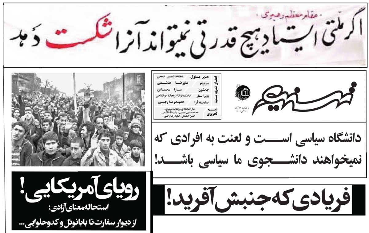 این نشریه در مطلبی با عنوان «صدای دانشجو خاموش شدنی نیست» با اشاره به روزهای شلوغ دانشگاه در آذر ۱۴۰۳ و حضور چهرههایی چون سعید جلیلی، علیرضا زاکانی، الیاس حضرتی و… از وضعیت کنونی مدیریت دانشگاه انتقاد نموده و از تبدیل دانشگاه به حیات خلوت مدیران و بیرون راندن فضای سیاسی از دانشگاه انتقاد کردند.