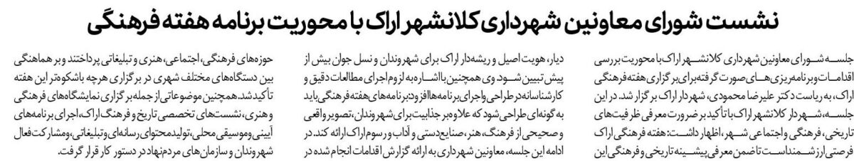 جلسه شورای معاونین شهرداری کلانشهر اراک با محوریت بررسی اقدامات و برنامهریزیهای صورت گرفته برای برگزاری هفته فرهنگی اراک، به ریاست دکتر علیرضا محمودی، شهردار اراک برگزار شد. در این جلسه، شهردار کلانشهر اراک با تأکید بر ضرورت معرفی ظرفیتهای تاریخی، فرهنگی و اجتماعی شهر، اظهار داشت: هفته فرهنگی اراک فرصتی ارزشمند است تا ضمن معرفی پیشینه تاریخی و فرهنگی این دیار، هویت اصیل و ریشهدار اراک برای شهروندان و نسل جوان بیش از پیش تبیین شود. وی همچنین با اشاره به لزوم اجرای مطالعات دقیق و کارشناسانه در طراحی و اجرای برنامهها افزود: برنامههای هفته فرهنگی باید بهگونهای طراحی شود که علاوه بر جذابیت برای شهروندان، تصویر واقعی و صحیحی از فرهنگ، هنر، صنایعدستی و آداب و رسوم اراک ارائه کند. در ادامه این جلسه، معاونین شهرداری به ارائه گزارش اقدامات انجام شده در حوزههای فرهنگی، اجتماعی، هنری و تبلیغاتی پرداختند و بر هماهنگی بین دستگاههای مختلف شهری در برگزاری هرچه باشکوهتر این هفته تأکید شد. همچنین موضوعاتی از جمله برگزاری نمایشگاههای فرهنگی و هنری، نشستهای تخصصی تاریخ و فرهنگ اراک، اجرای برنامههای آیینی و موسیقی محلی، تولید محتوای رسانهای و تبلیغاتی، و مشارکت فعال شهروندان و سازمانهای مردمنهاد در دستور کار قرار گرفت.